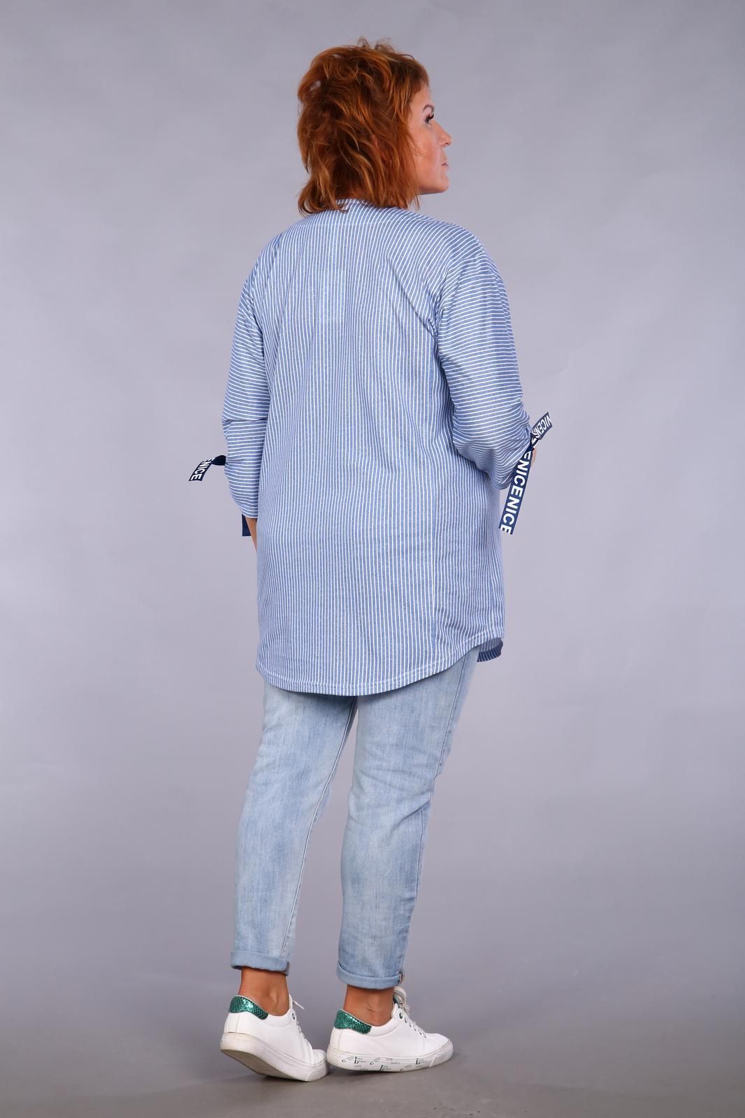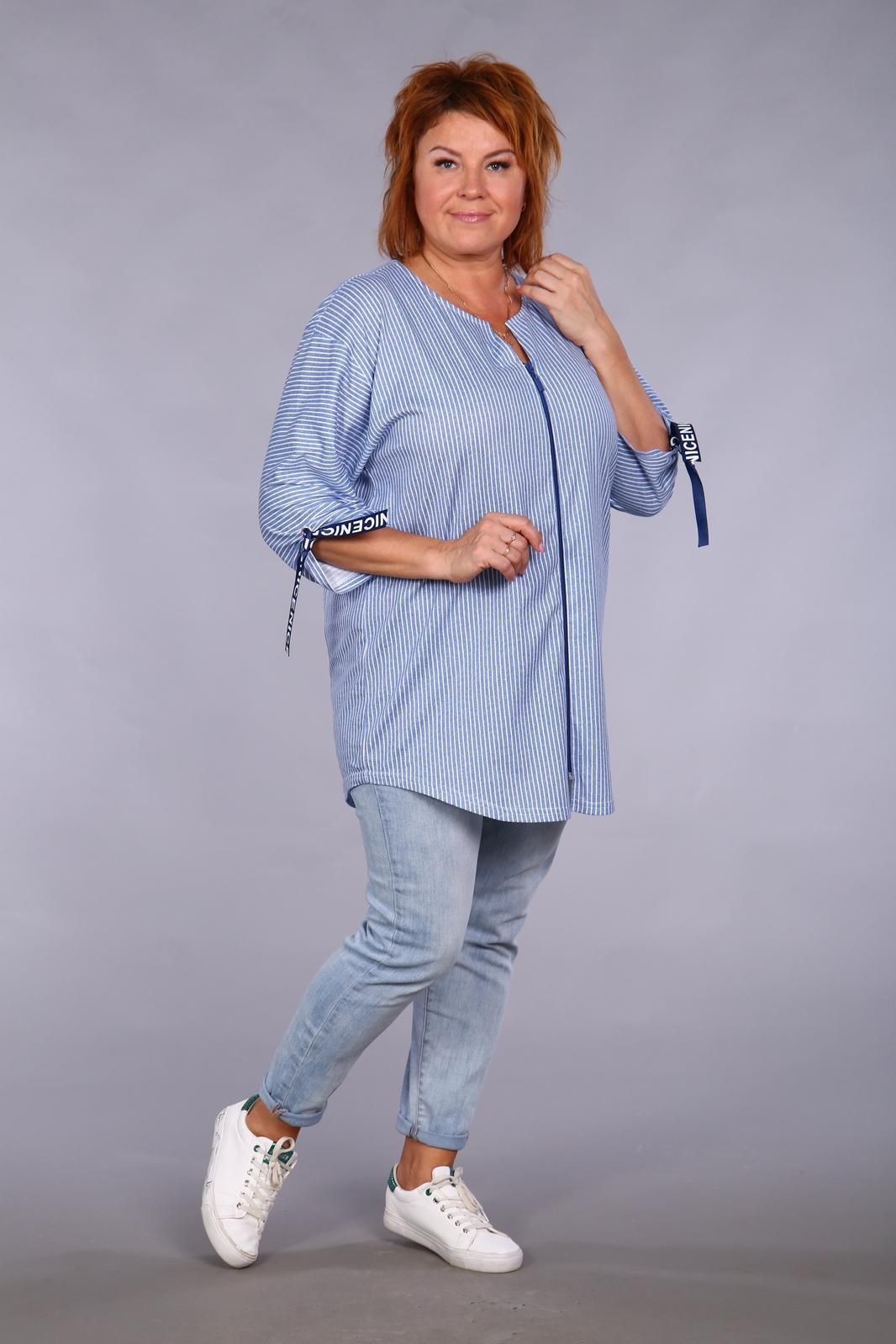 Туника прямого силуэта из ткани в полоску на молнии. Горловина округлой формы. Низ изделия оформлен плавной кривой линией. Рукав изделия длиной ¾. Снизу на рукаве расположен люверс и отделочная тесьма, с  помощью которых можно регулировать длину рукава. Продольная полоска зрительно вытягивает женскую фигуру, придавая стройность.