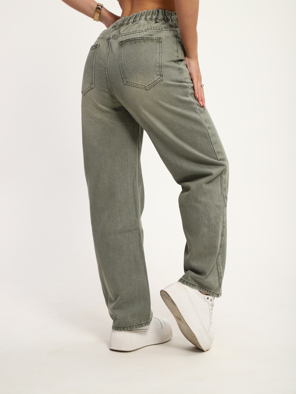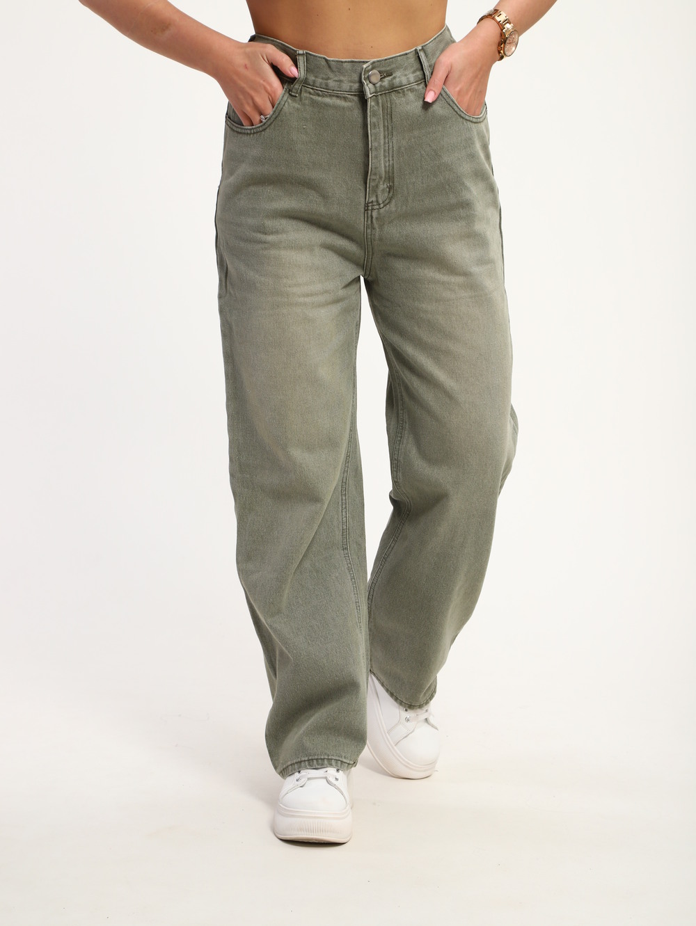 Женские джинсы на высокой посадке цвета хаки стильное и универсальное решение для современного гардероба. Высокий пояс визуально удлиняет ноги и подчеркивает талию, а плотная, приятная к телу ткань обеспечивает комфорт на протяжении всего дня. Цвет хаки легко сочетается с разными элементами одежды, добавляя образу свежести и оригинальности. Эти джинсы отлично подходят для повседневных прогулок, работы или встреч с друзьями, сохраняя актуальность в любое время года. Цвет: хаки; Материал: джинс;джинс; Состав: 100% хлопок.
