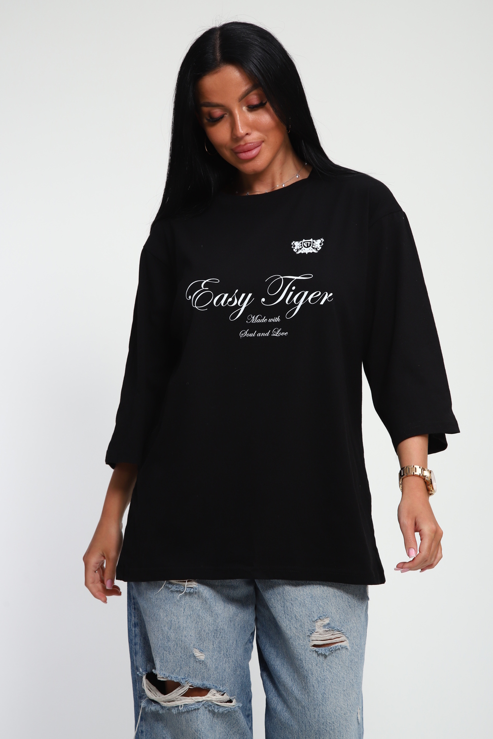 Эта женская футболка идеальный выбор для тех, кто ценит комфорт и стиль. В стиле оверсайз подходит для девушек, которые любят свободную и непринужденную одежду. Удлиненный рукав дает свободу действий.