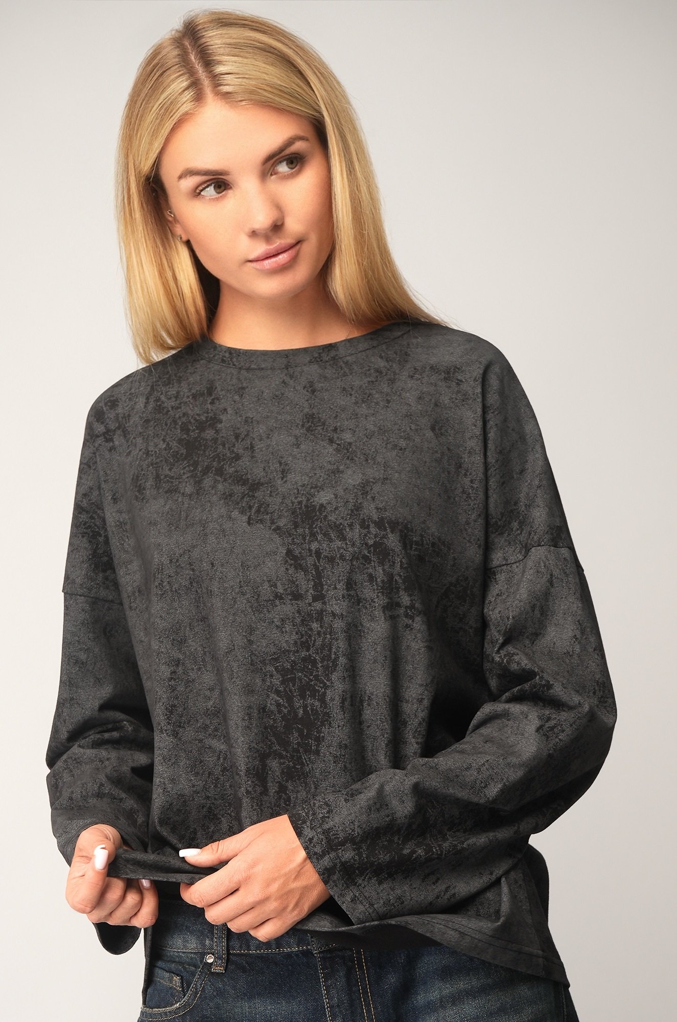 Черный лонгслив с варёным эффектом — н..показатьастоящая находка для любительниц расслабленного стиля и лёгкого винтажного флёра! Женский трикотажный лонг оверсайз создан для тех, кто ценит комфорт и индивидуальность.
