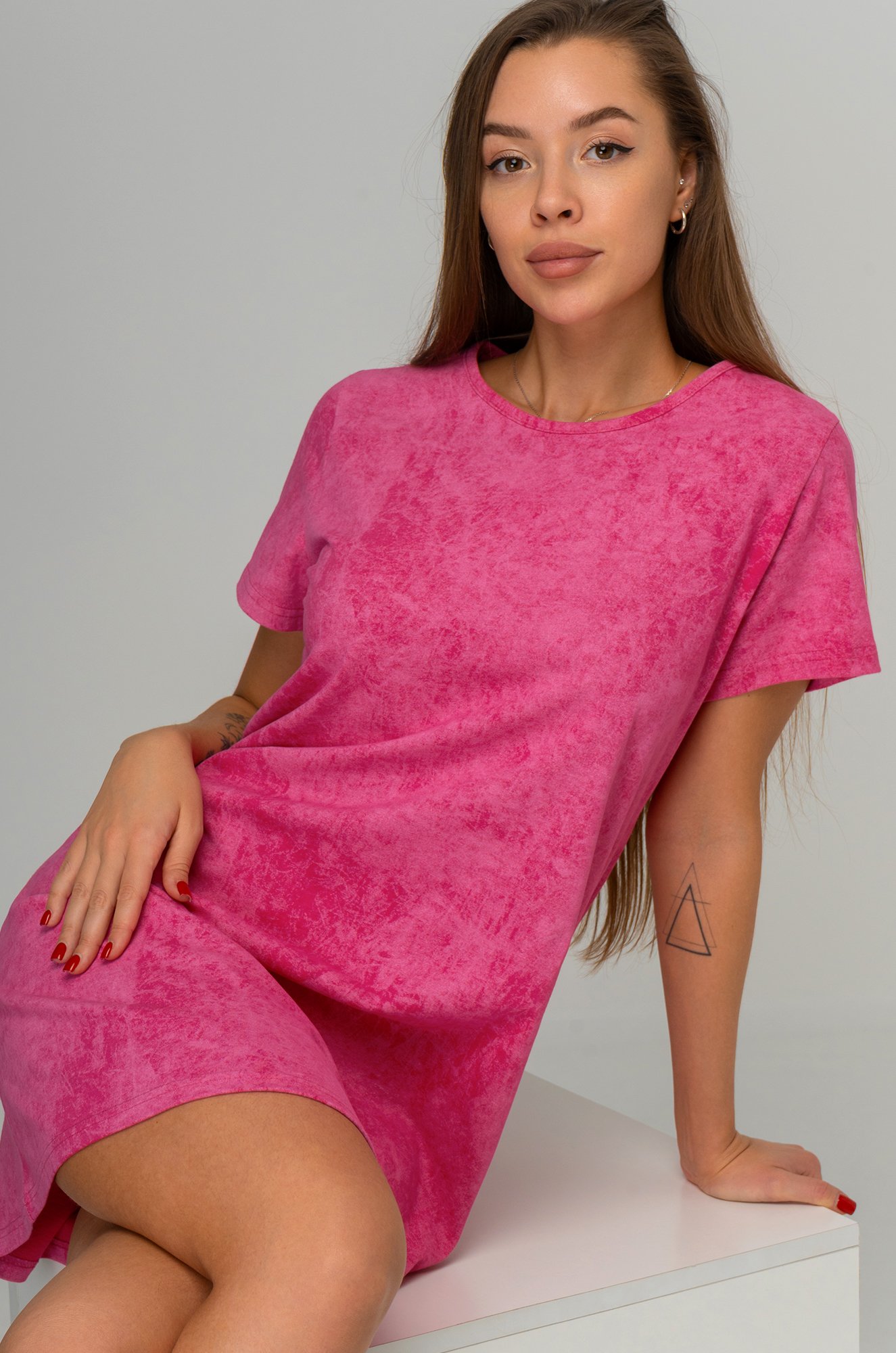 Повседневное домашнее платье выполнено из нежного, приятного к телу 100% хлопка. Трикотажная ткань кулирная гладь хорошо пропускает воздух. Хлопковый трикотаж мягкий и приятный к телу. Короткая туника с винтажным вареным эффектом идеальна для образов на лето.