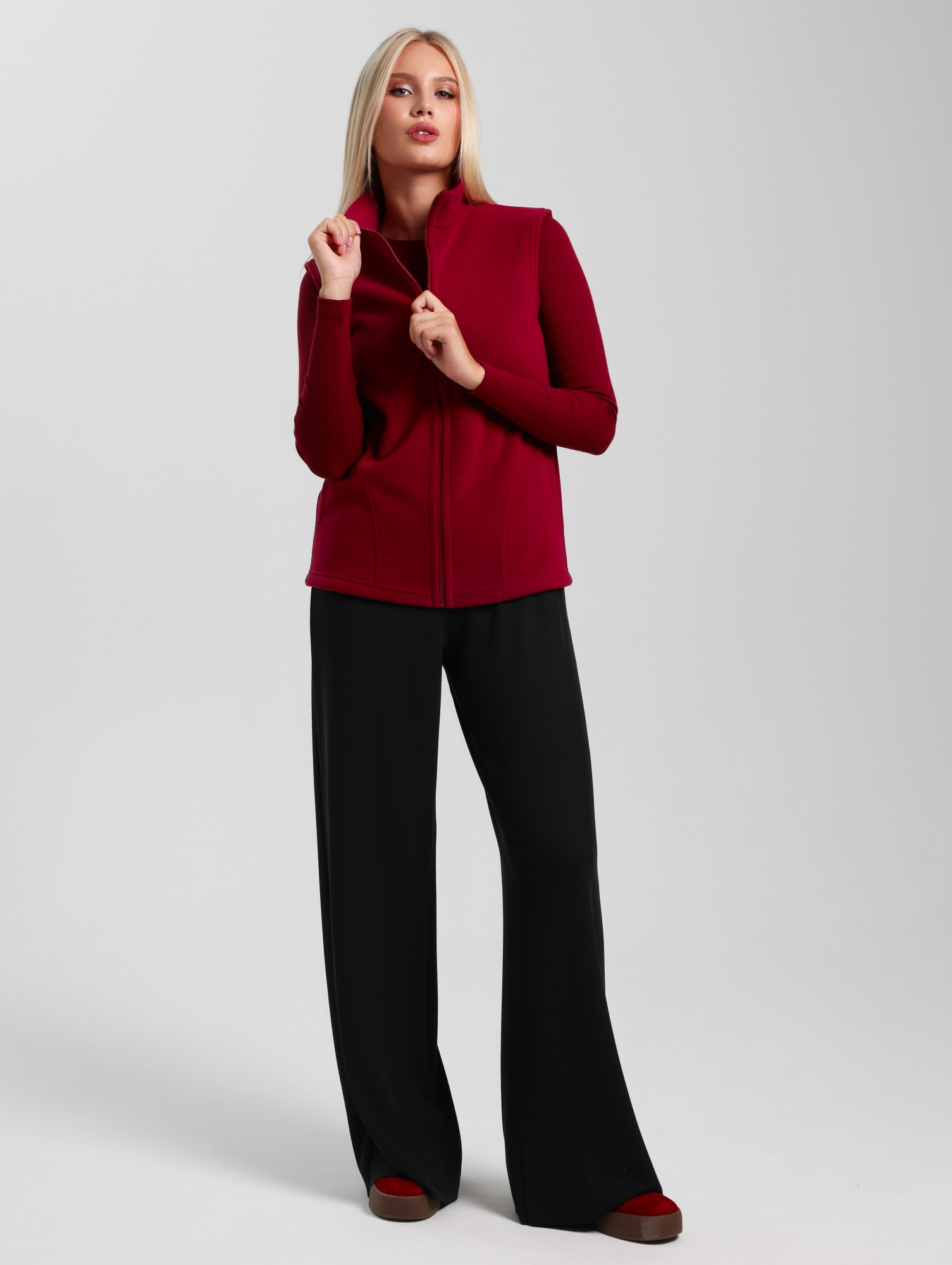 Жилет молодежный из трикотажного полотна «флис», полуприлегающего силуэта, воротником «стойка», карманами в боковых швах фигурной формы, центральной бортовой застежкой на тесьму «молния».