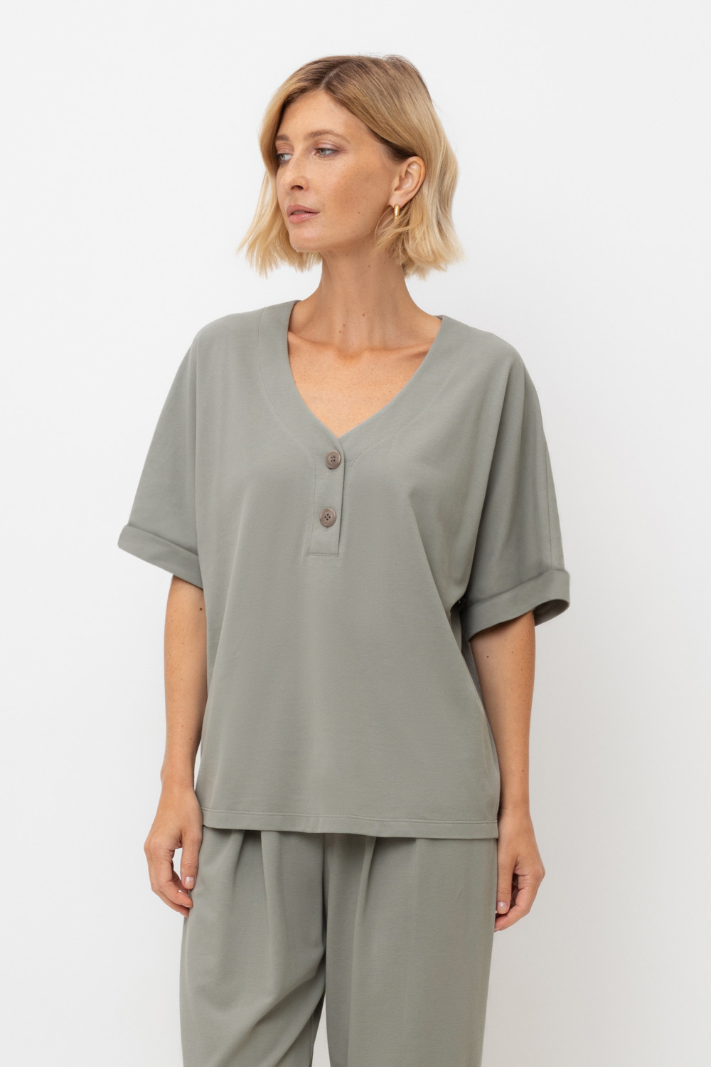 Трикотажная футболка с удлиненными рукавами изготовлена из легкого хлопка с рельефной текстурой пике. Широкие манжеты и V-вырез с пуговицами в тон изделия позволяют сочетать ее как с классическими, так и с более спортивными стилями.