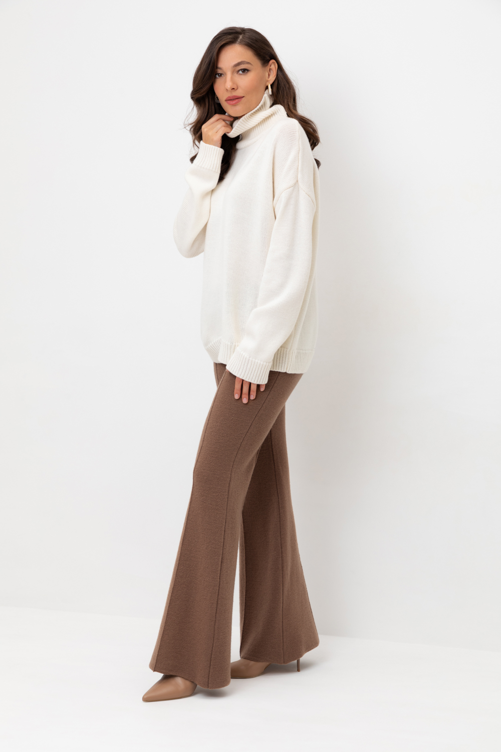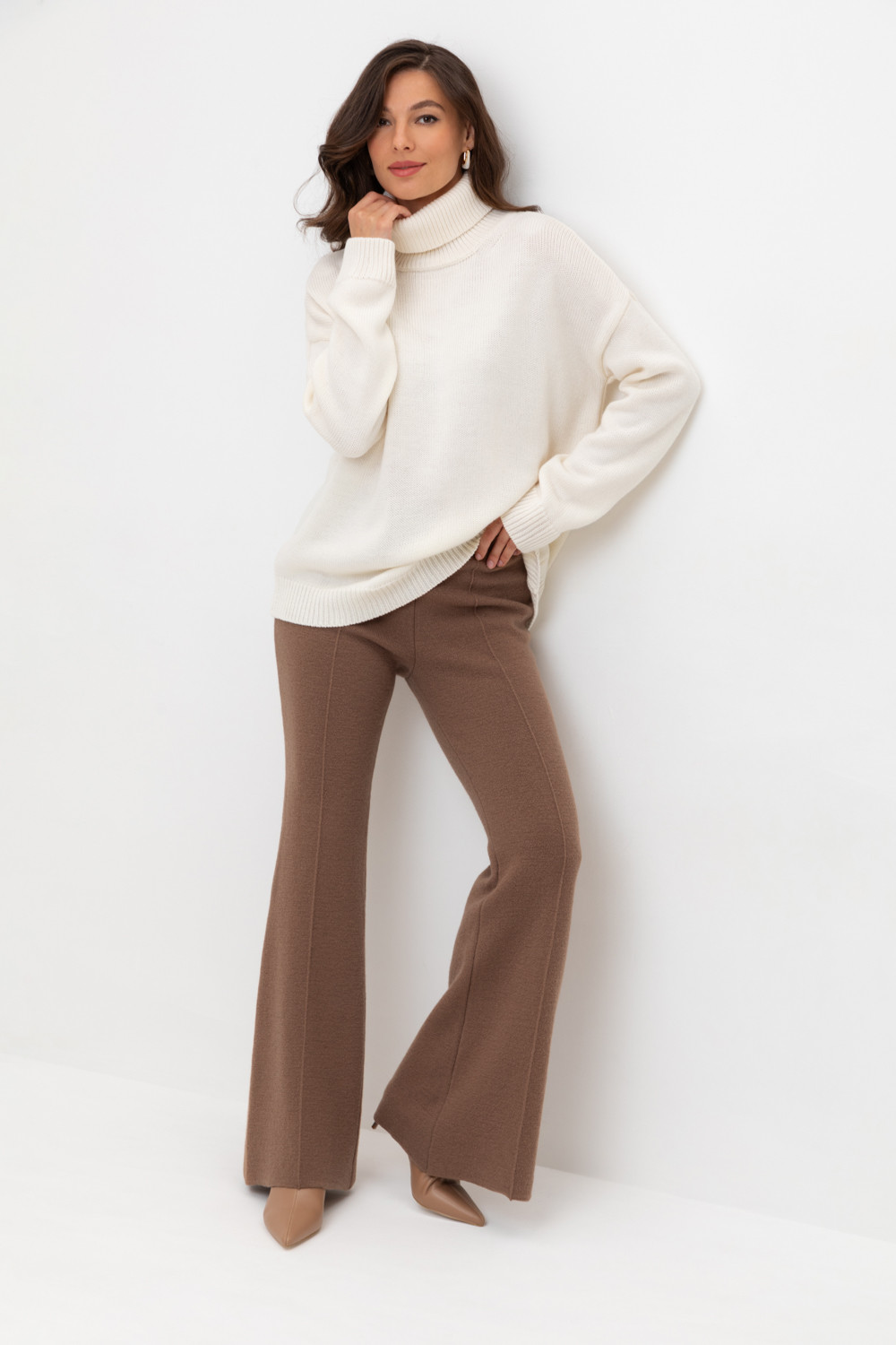 Удобные вязаные брюки со стрелкой из 100% шерсти. Шерсть в составе хорошо сохраняет тепло. Пояс на резинке.