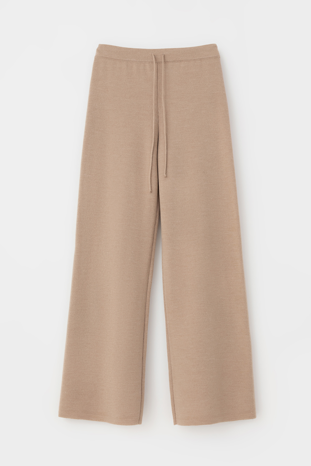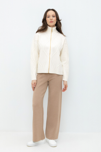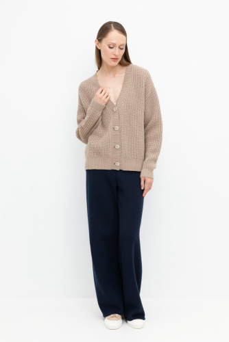 Пояс регулируется вязаным шнуром в тон брюк. Плотная фактура вязания согревает и сохраняет форму во время носки.