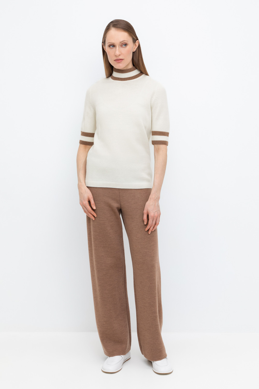 Удобные вязаные брюки прямого силуэта. Выполнены из мягкой полушерстяной пряжи. Шерсть в составе сохраняет тепло, а благодаря волокнам акрила изделие мягкое и дольше сохраняет форму.