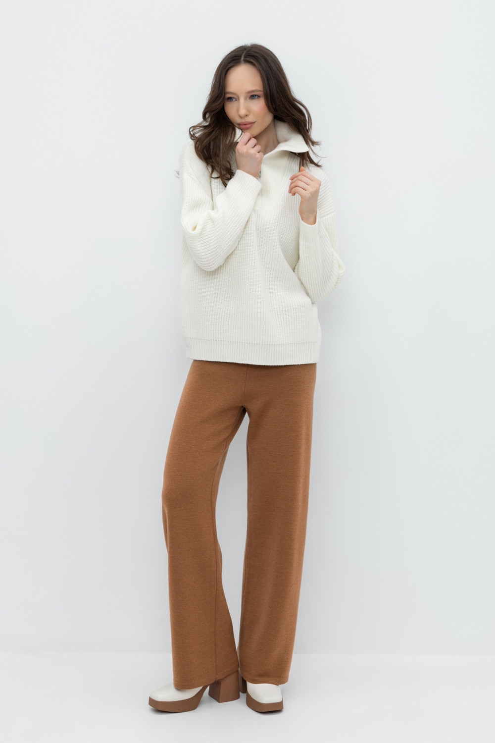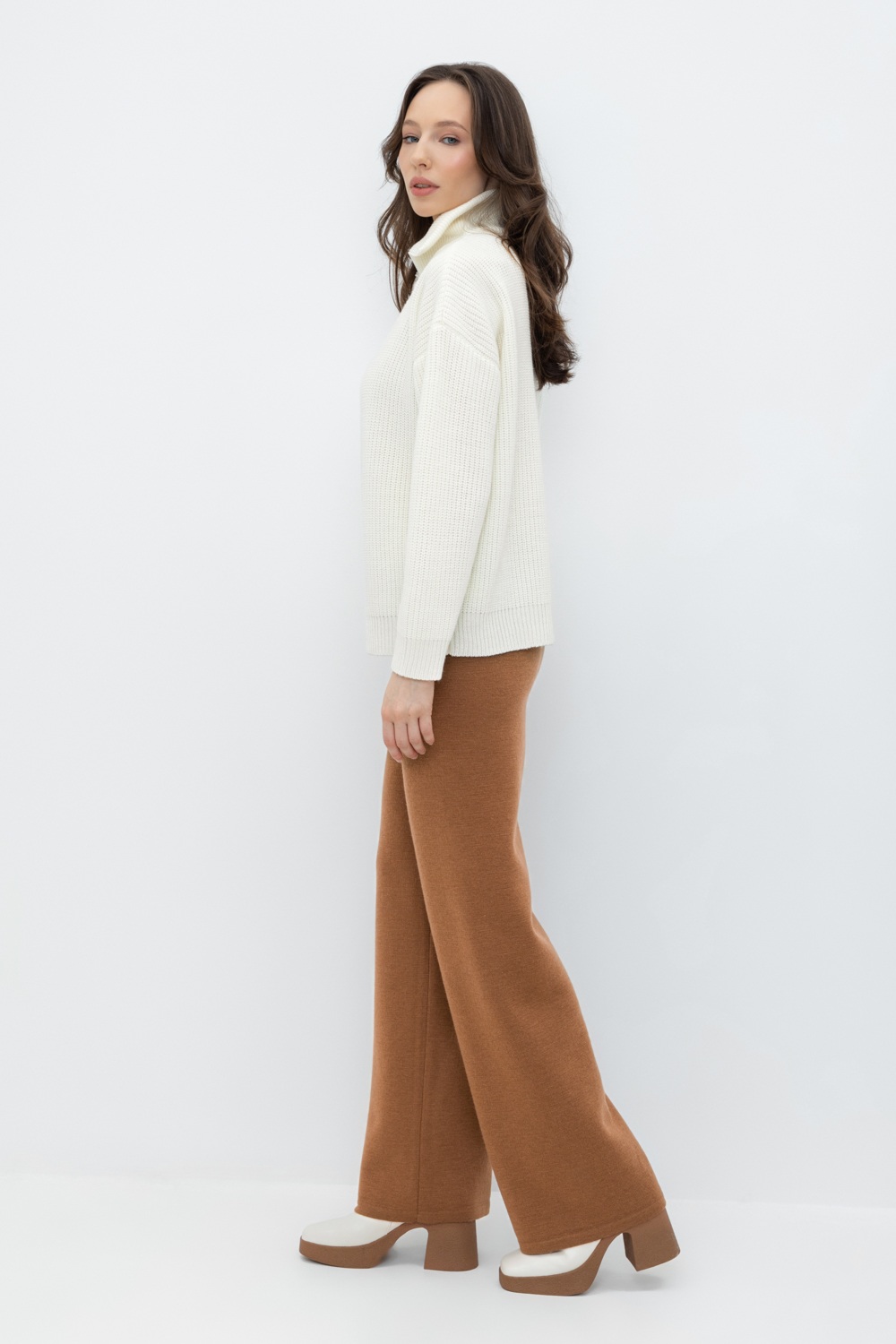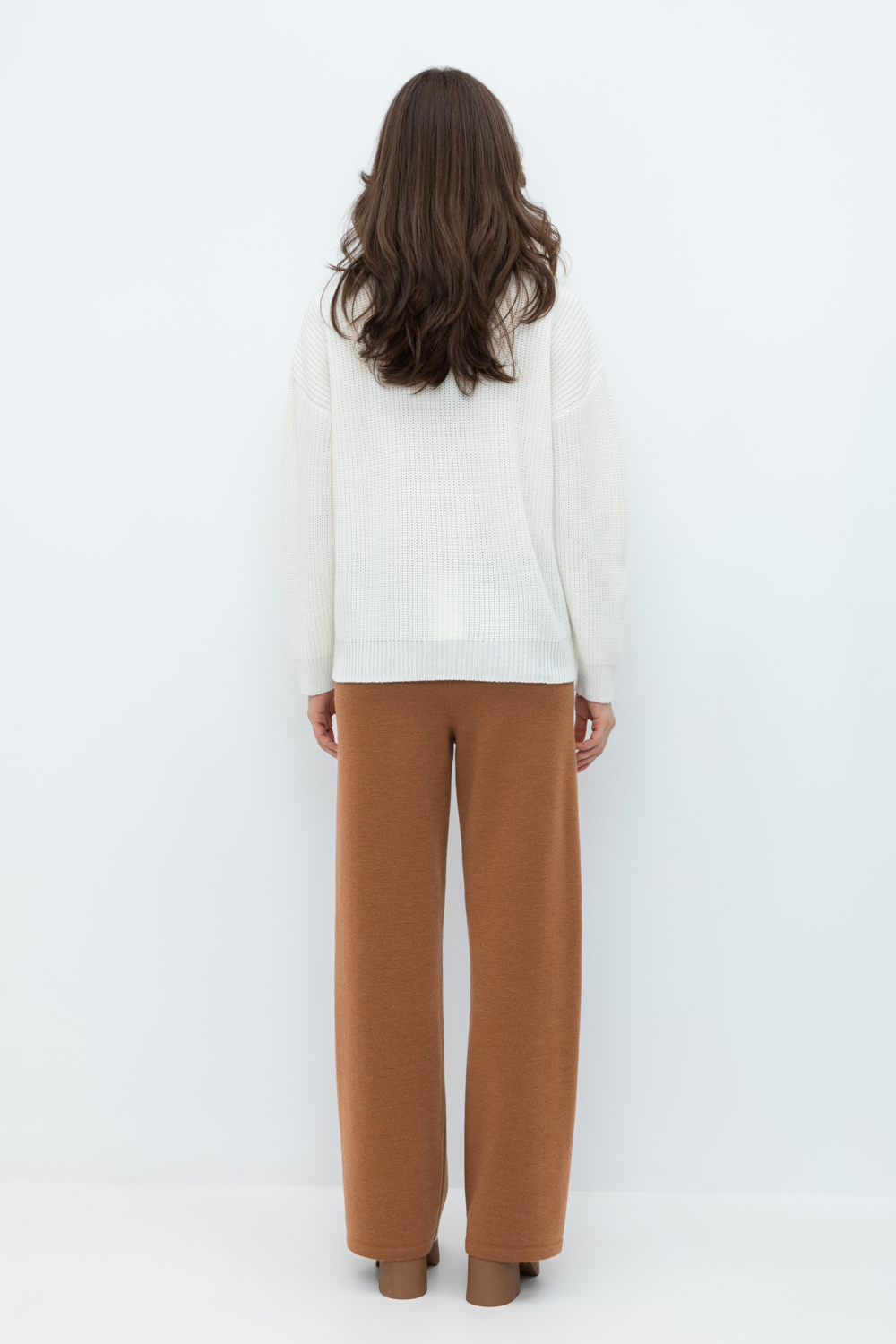 Удобные вязаные брюки прямого силуэта. Выполнены из мягкой полушерстяной пряжи. Шерсть в составе сохраняет тепло, а благодаря волокнам акрила изделие мягкое и дольше сохраняет форму.