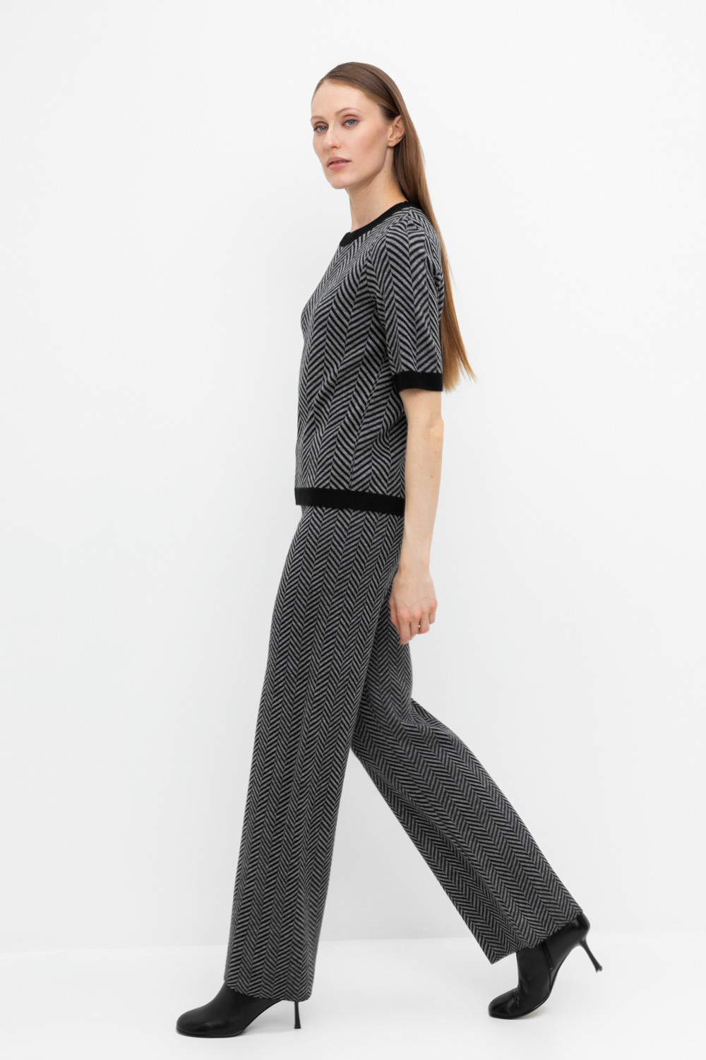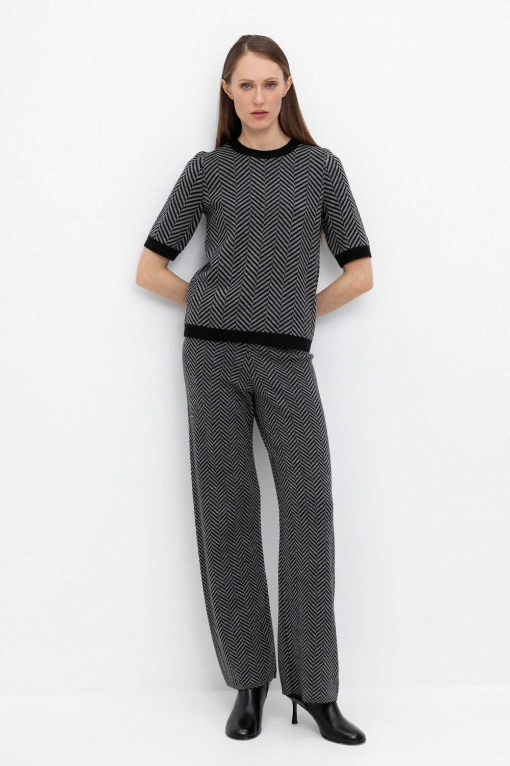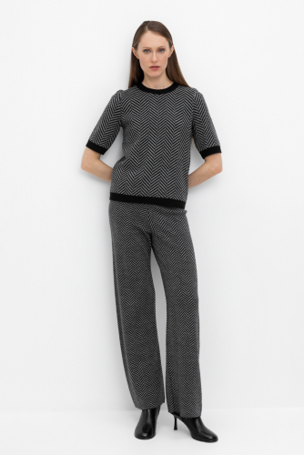 Удобные вязаные брюки прямого силуэта. Связаны жаккардом из мягкой полушерстяной пряжи. В составе 50% шерсти и 50% акрила. Шерсть в составе сохраняет тепло, а благодаря волокнам акрила изделие мягкое и дольше сохраняет форму. Плотная фактура вязания согревает и сохраняет форму во время носки.