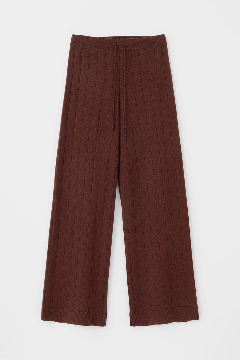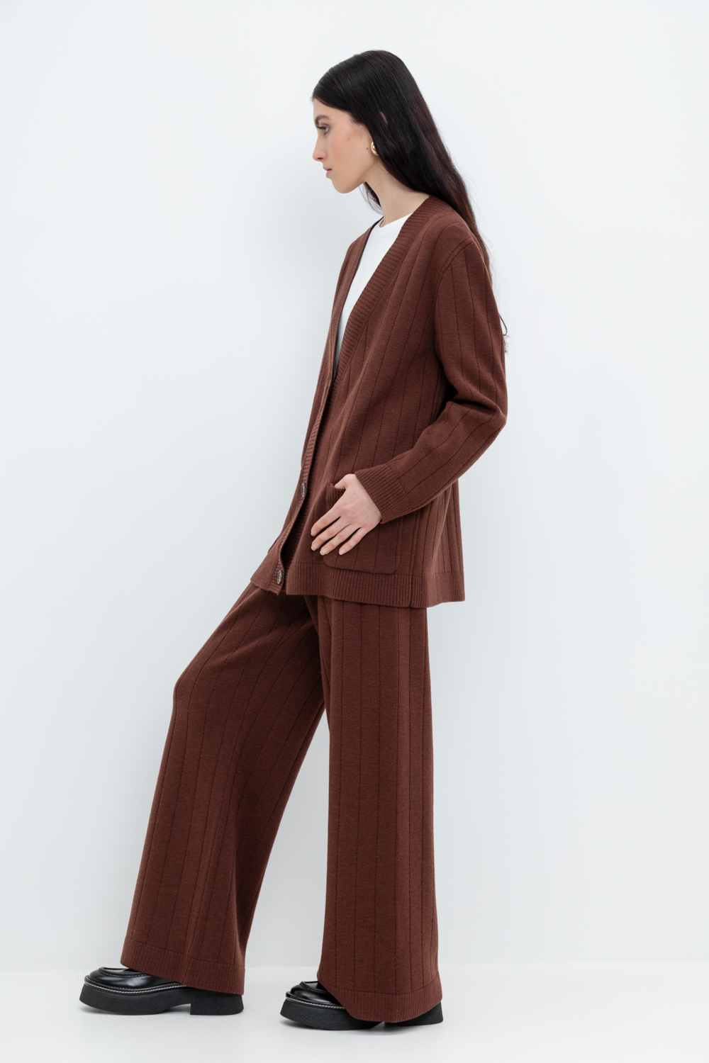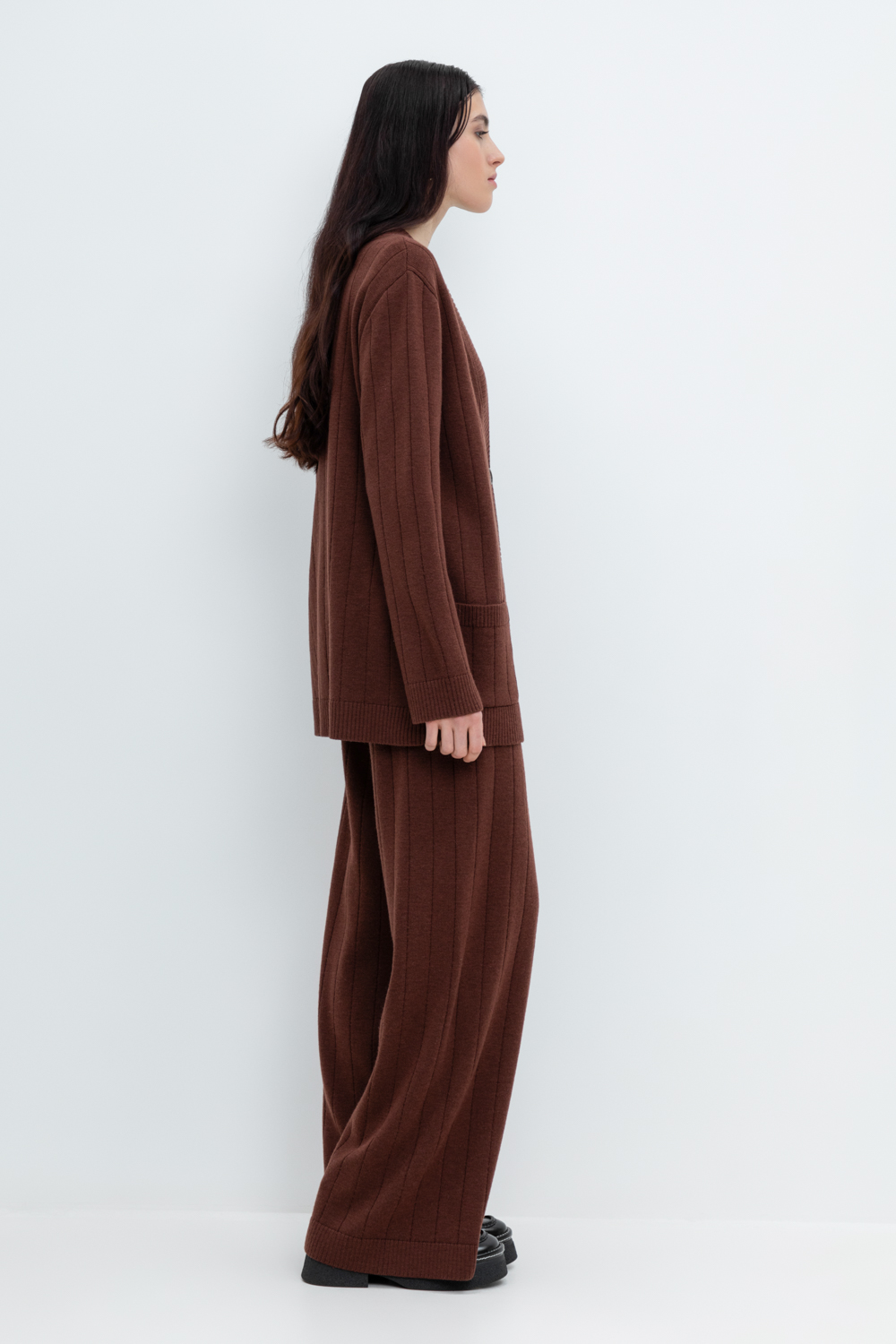 Пояс регулируется вязаным шнуром в тон брюк. Плотная фактура вязания согревает и сохраняет форму во время носки.