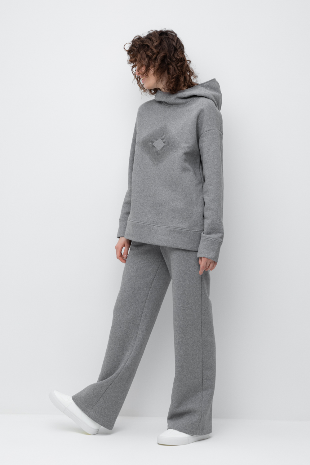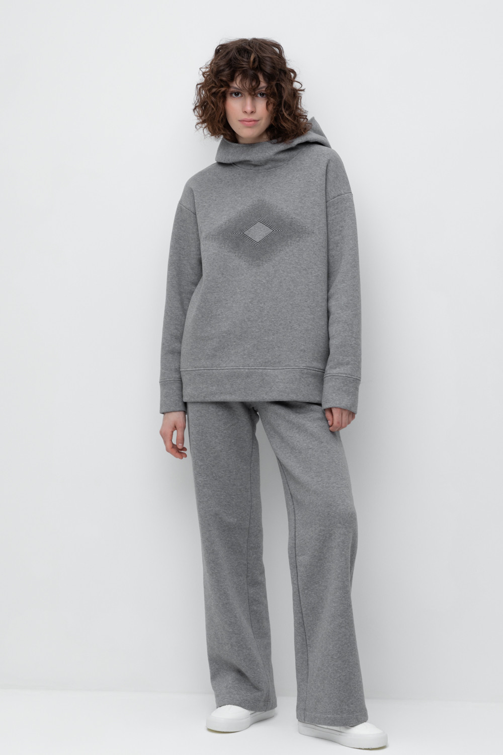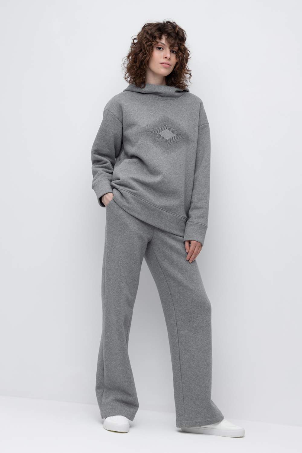 Брюки прямого кроя с боковыми карманами из мягкого футера трехнитки. Пояс регулируется с помощью вязаного шнура. В составе 80% натурального хлопка и 20% полиэстера, при этом полиэстер ввязан внутрь по особой технологии и не соприкасается с кожей.