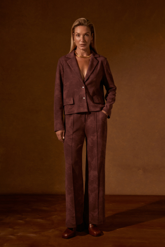 Свободные женские брюки со стрелкой и боковыми карманами из плотного гладкого трикотажа интерлок. Застежка на кнопку. Низ обработан плоскими швами.