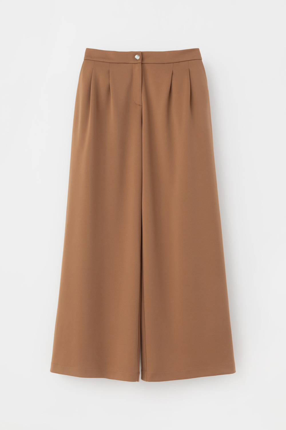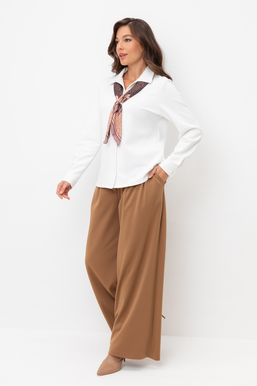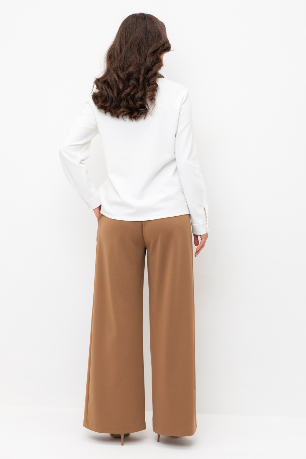 Свободные женские брюки со складками и боковыми карманами из плотного гладкого трикотажа интерлок. Застегиваются на молнию и кнопку. Низ обработан плоскими швами.