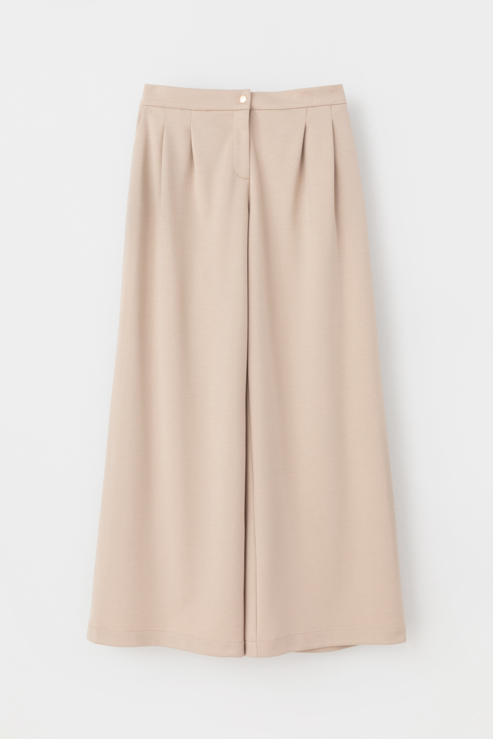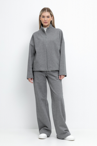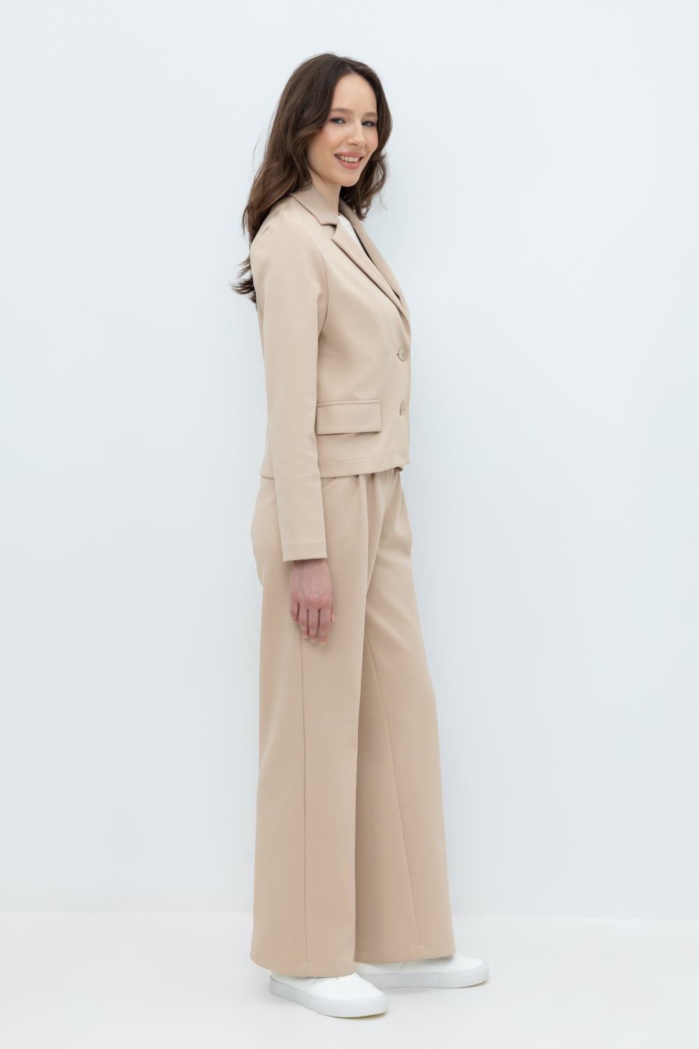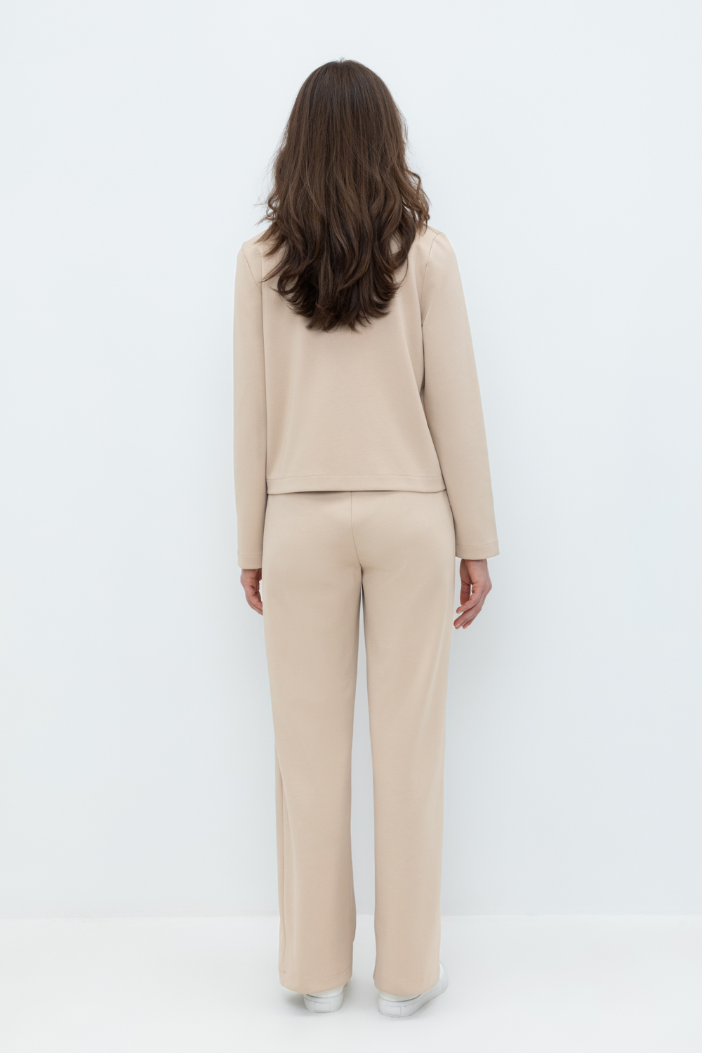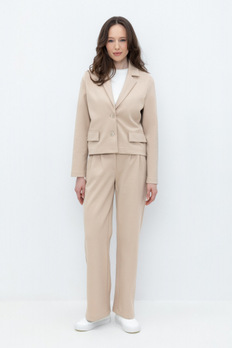 Свободные женские брюки со складками и боковыми карманами из плотного гладкого трикотажа интерлок. Застегиваются на молнию и кнопку. Низ обработан плоскими швами.