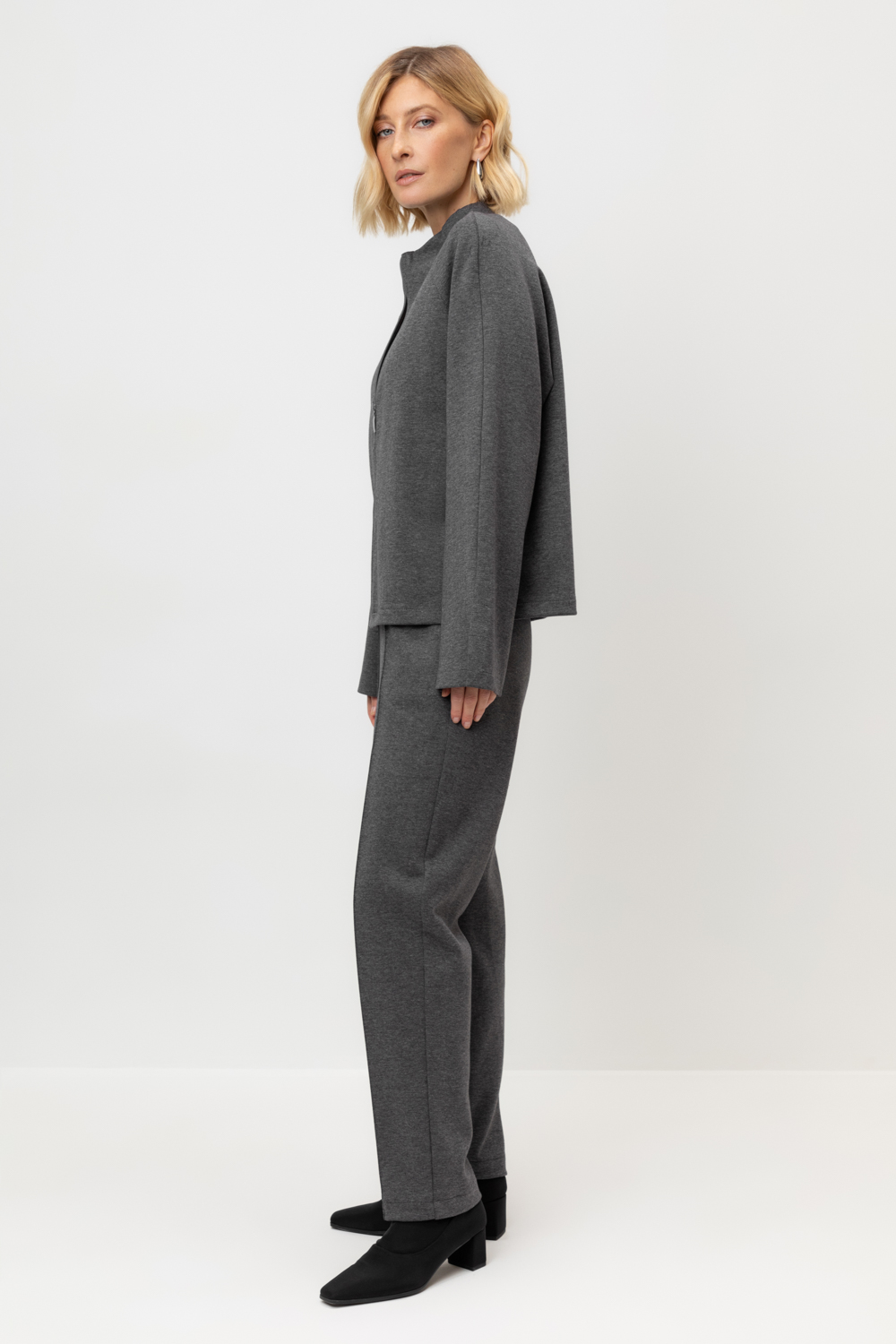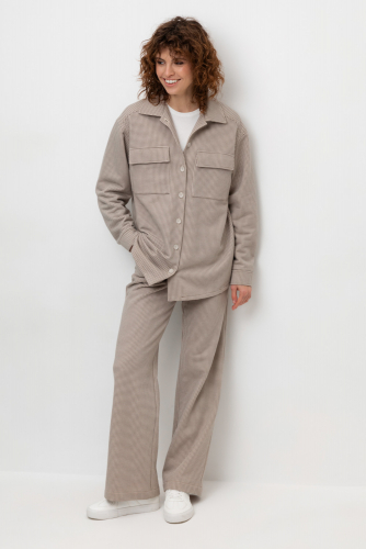 Брюки прямого кроя со стрелкой и боковыми карманами из плотного гладкого трикотажа интерлок. В составе 80% натурального хлопка и 20% полиэстера, при этом полиэстер ввязан внутрь по особой технологии и не соприкасается с кожей.