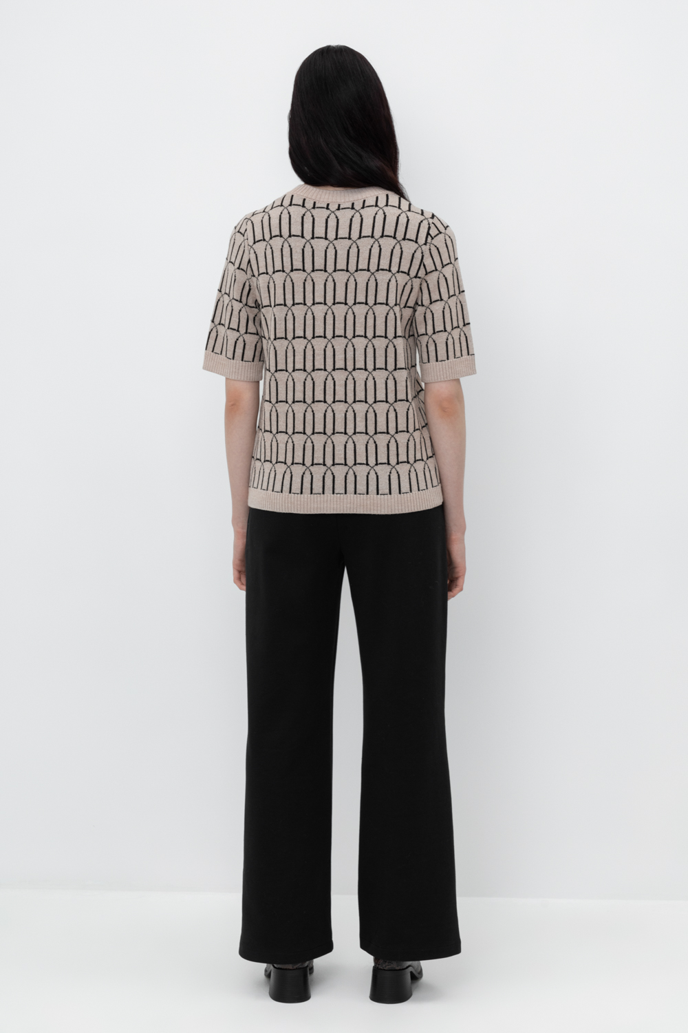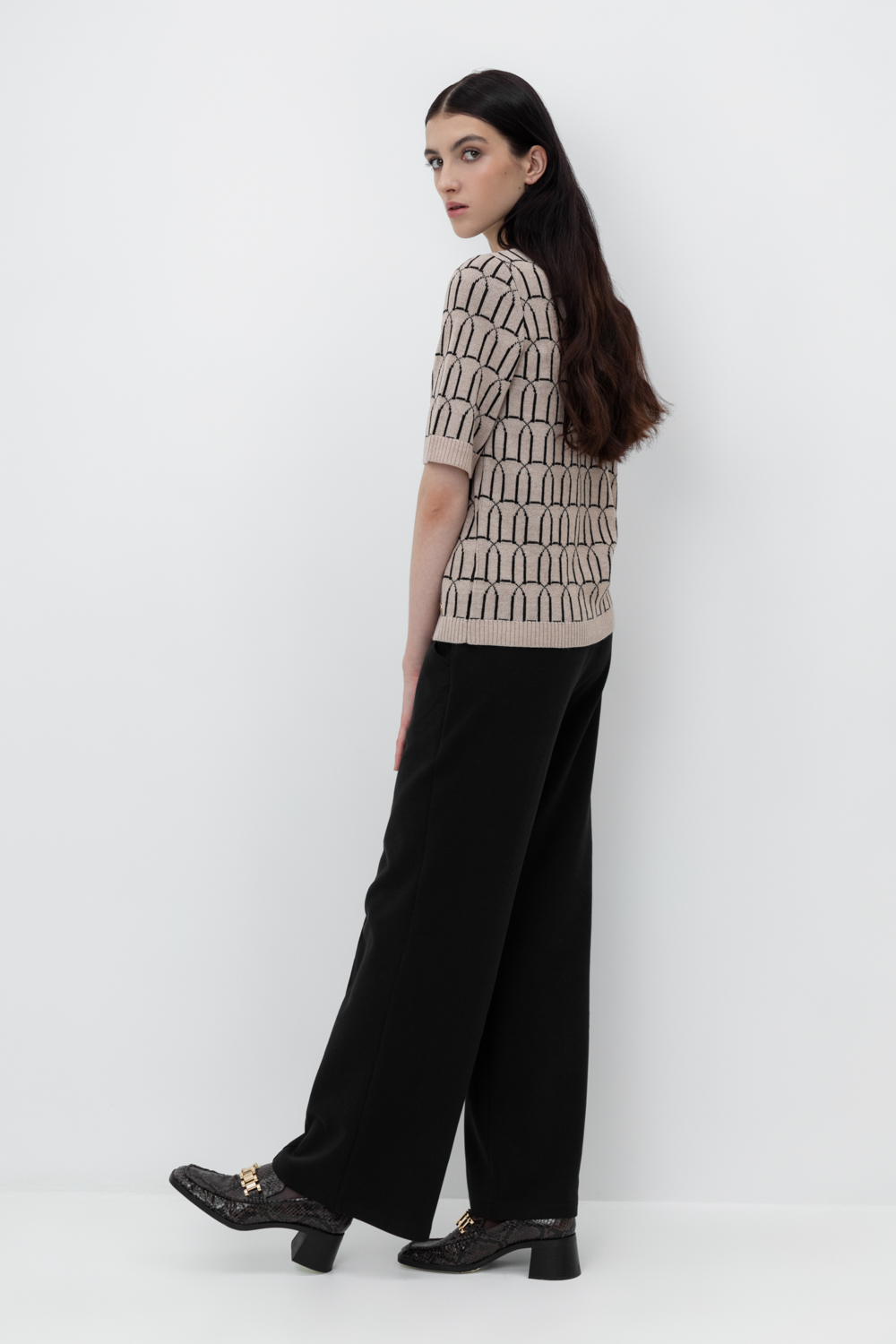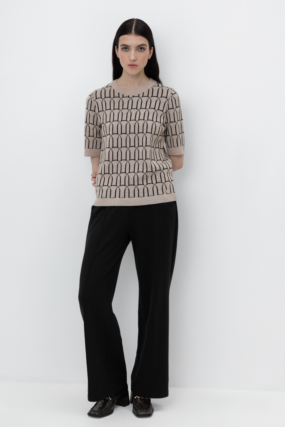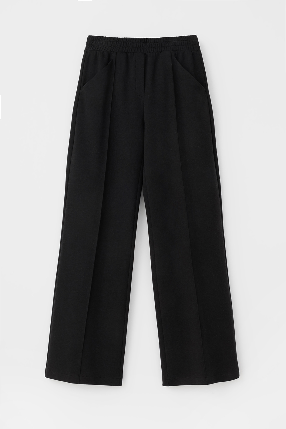 Брюки прямого кроя со стрелкой и боковыми карманами из плотного гладкого трикотажа интерлок.