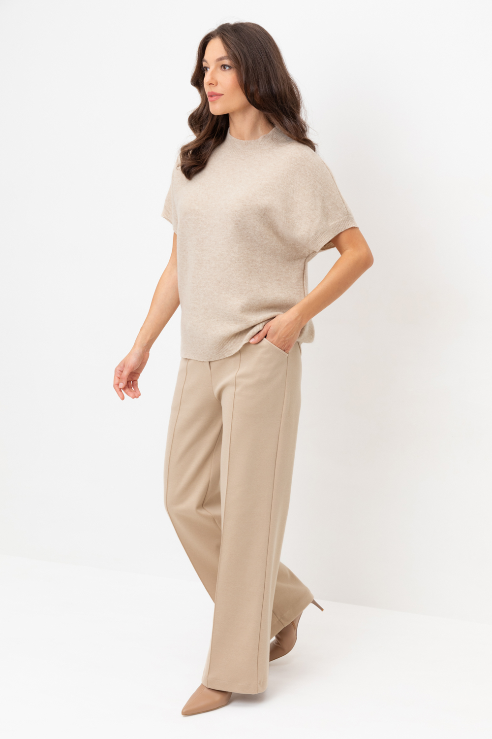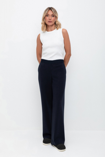 Брюки прямого кроя со стрелкой и боковыми карманами из плотного гладкого трикотажа интерлок. Пояс на резинке обеспечивает комфортную посадку.