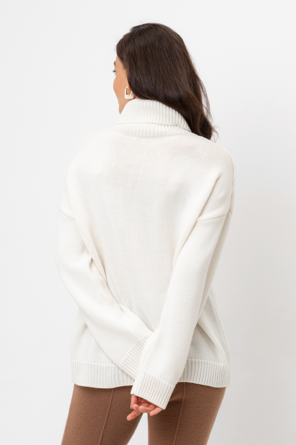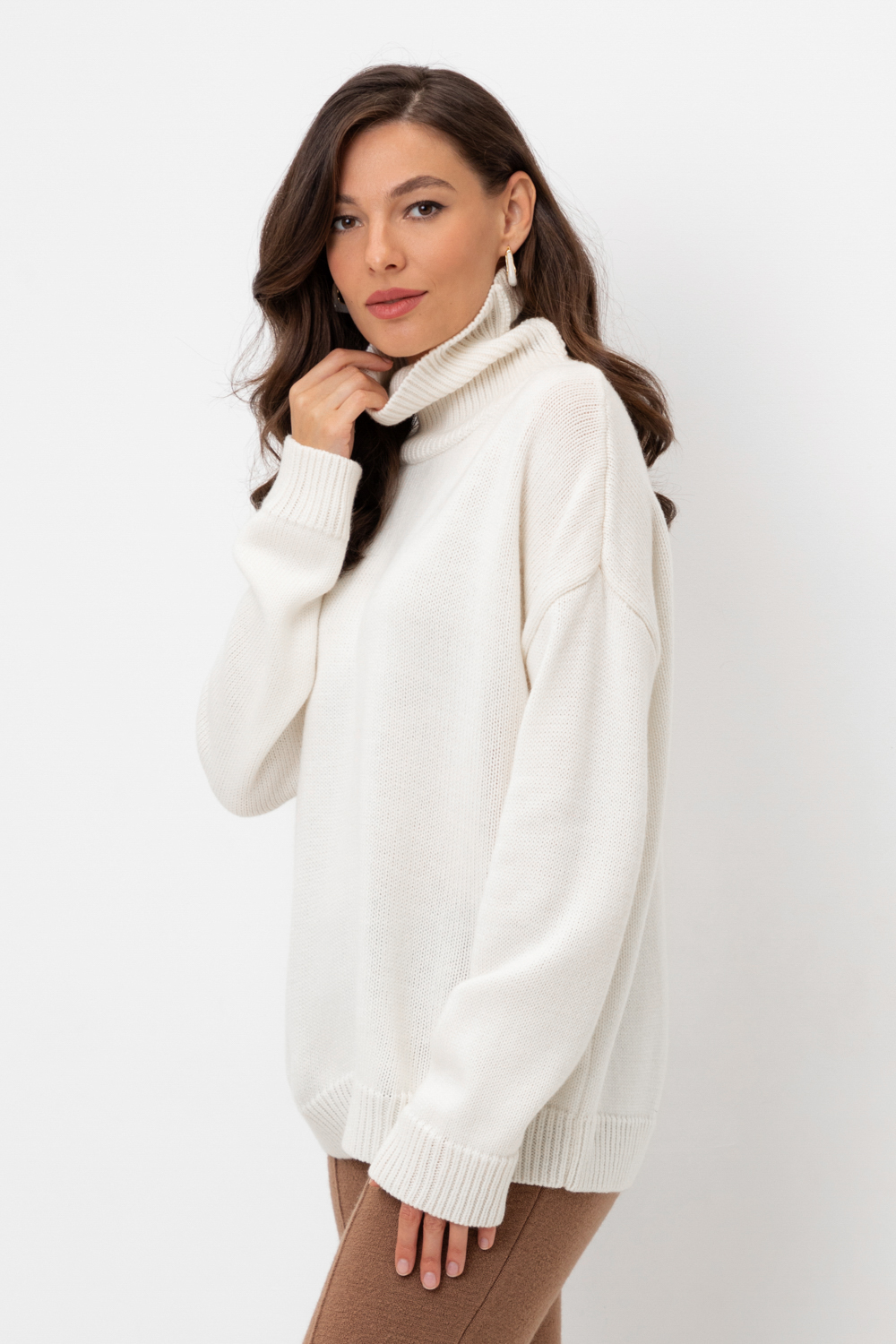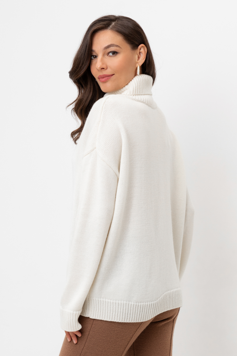 Уютный вязаный джемпер из полушерстяной пряжи. Шерсть в составе сохраняет тепло, а волокна акрила добавляют мягкость и объем. Выполнен гладью. Комфортная длинные цельнокроеные рукава придают изделию объем.