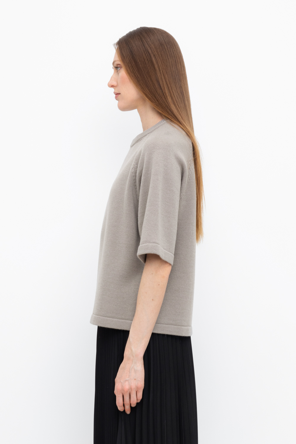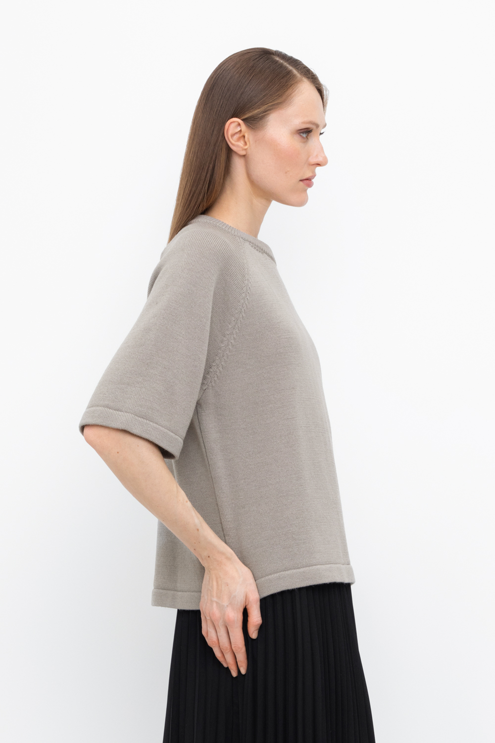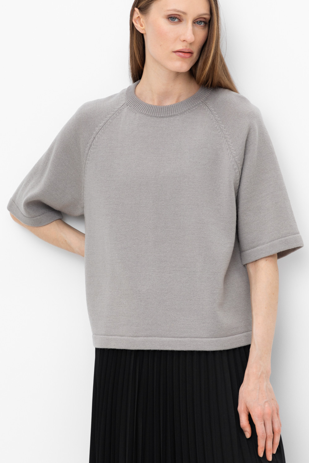 Джемпер в стиле прямой футболки стандартной длины с короткими рукавами-реглан. Выполнен гладью. Средняя плотность вязания и пластичная фактура сохраняют форму изделия.