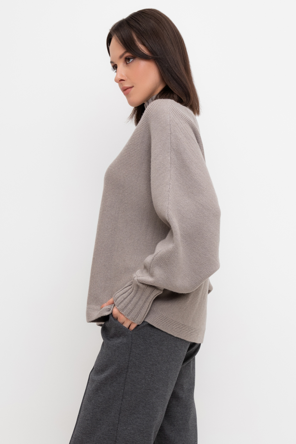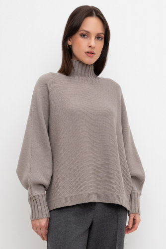 Уютный вязаный джемпер с воротником-стойкой из полушерстяной пряжи. Шерсть в составе сохраняет тепло, а волокна акрила добавляют мягкость и объем. Выполнен гладью. Комфортная длинные цельнокроеные рукава придают изделию объем.