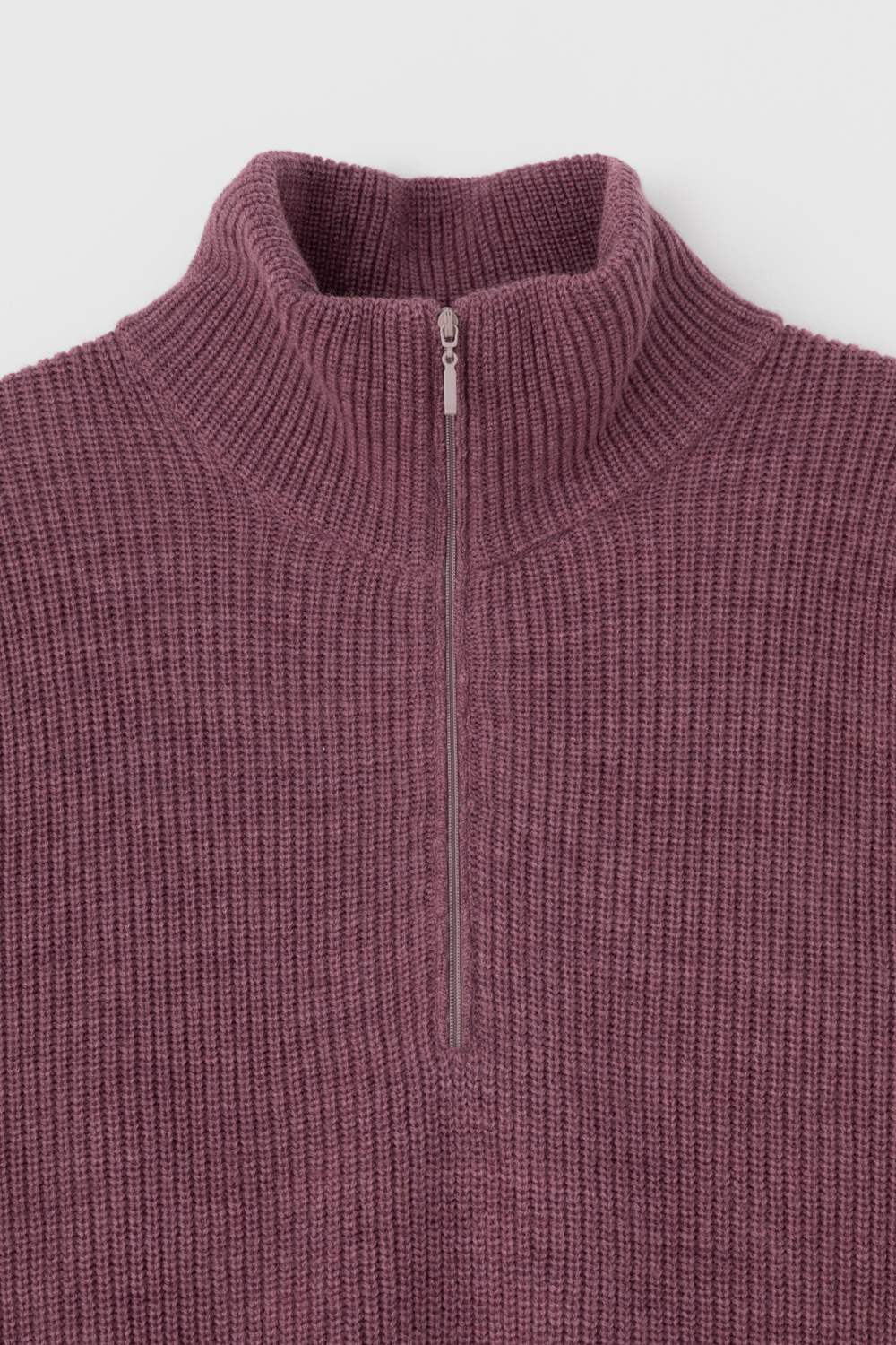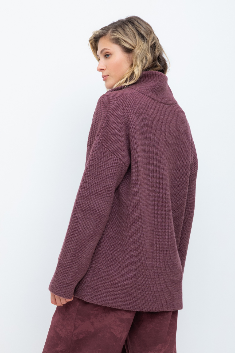 Уютный джемпер в стиле оверсайз со спущенным плечом и объемными рукавами из полушерстяной пряжи. Воротник-стойка застёгивается на молнию.