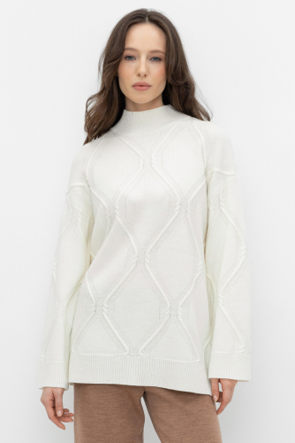Уютный вязаный джемпер с красивым вывязанным узором и воротником-стойкой из полушерстяной пряжи. Шерсть мериноса в составе сохраняет тепло, а волокна акрила добавляют мягкость и объем. Комфортная посадка и спущенные плечи придают изделию объем.