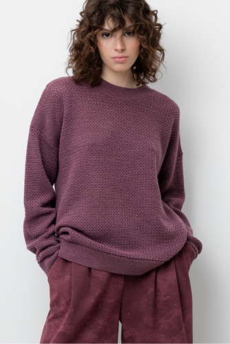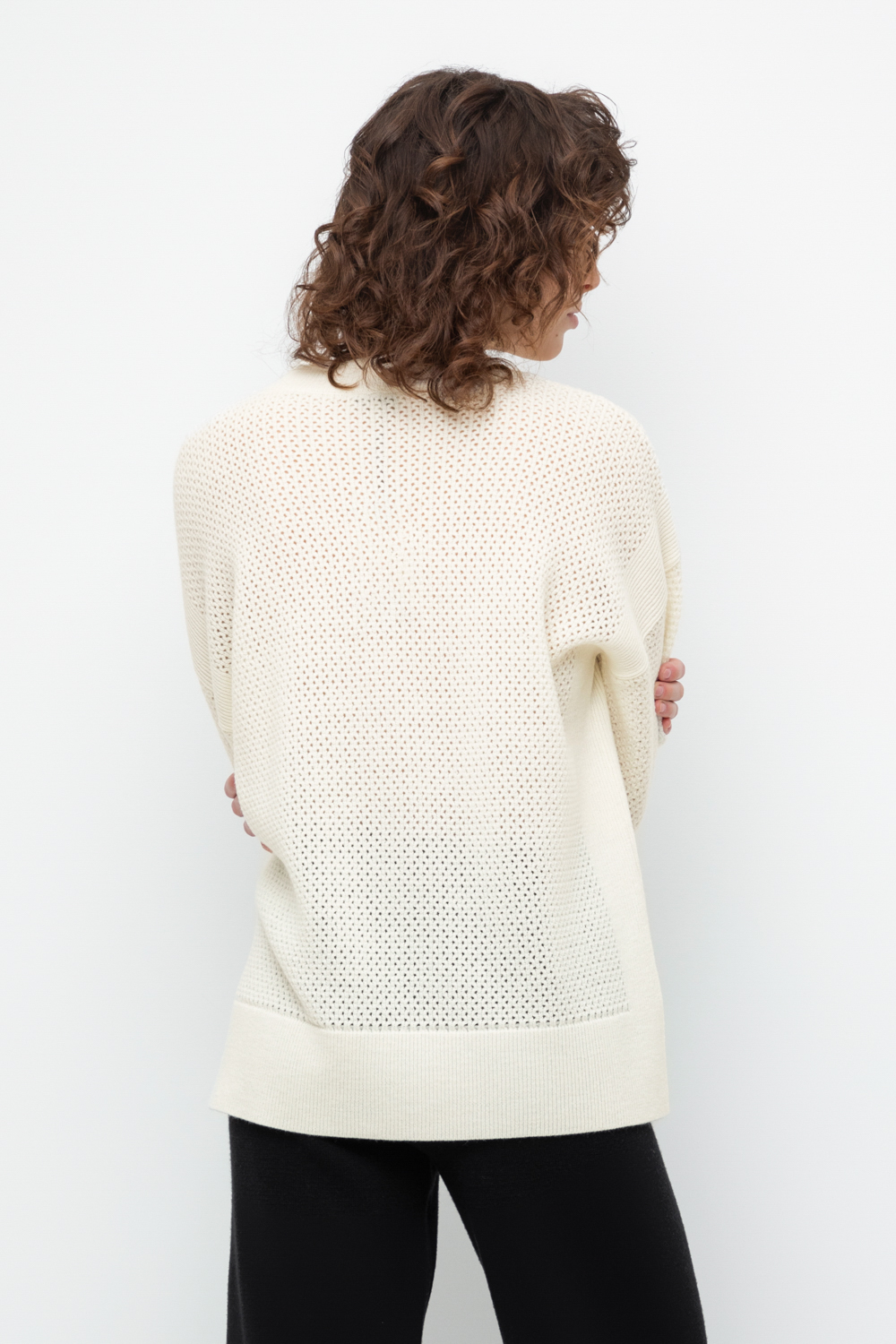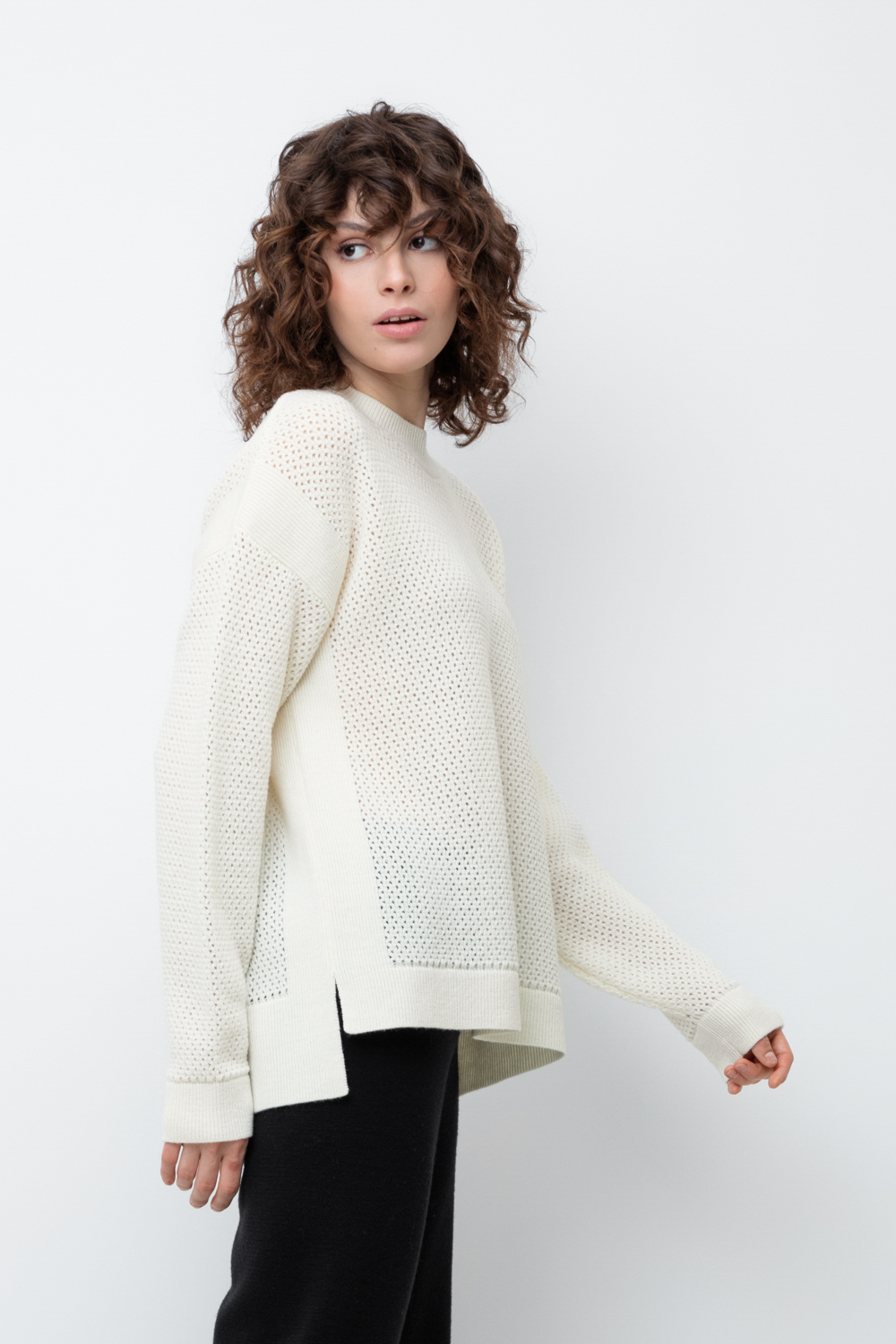Джемпер с удлиненной спинкой и разрезами по бокам связан ажурной вязкой "волна". Средняя плотность вязания и пластичная фактура сохраняют форму изделия.