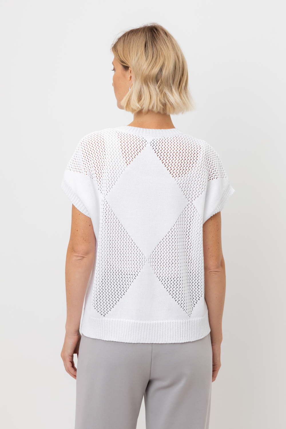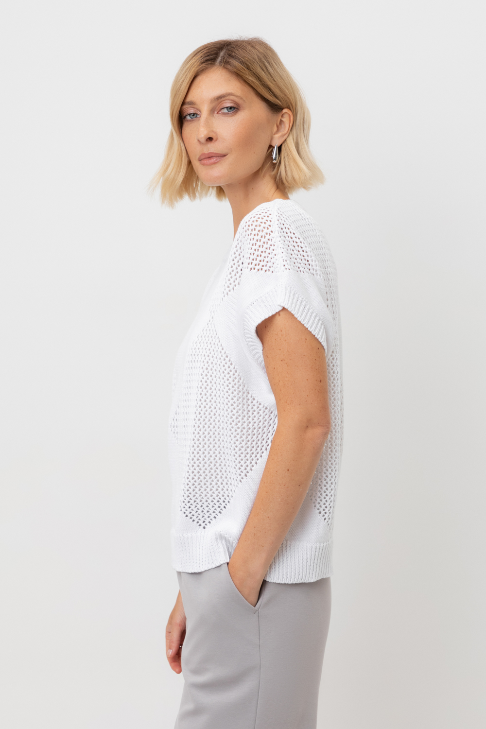 Джемпер со спущенным плечом ажурной вязки из итальянского хлопка. Умеренное переплетение, хлопок в составе придают изделию форму и ощущение комфорта во время носки. Незаменим в повседневном летнем гардеробе.