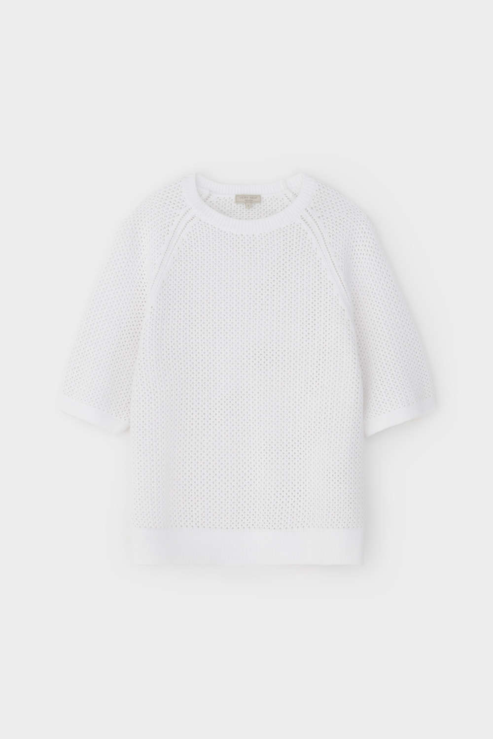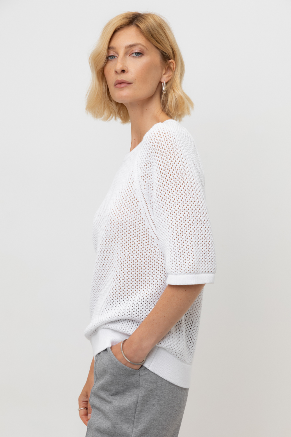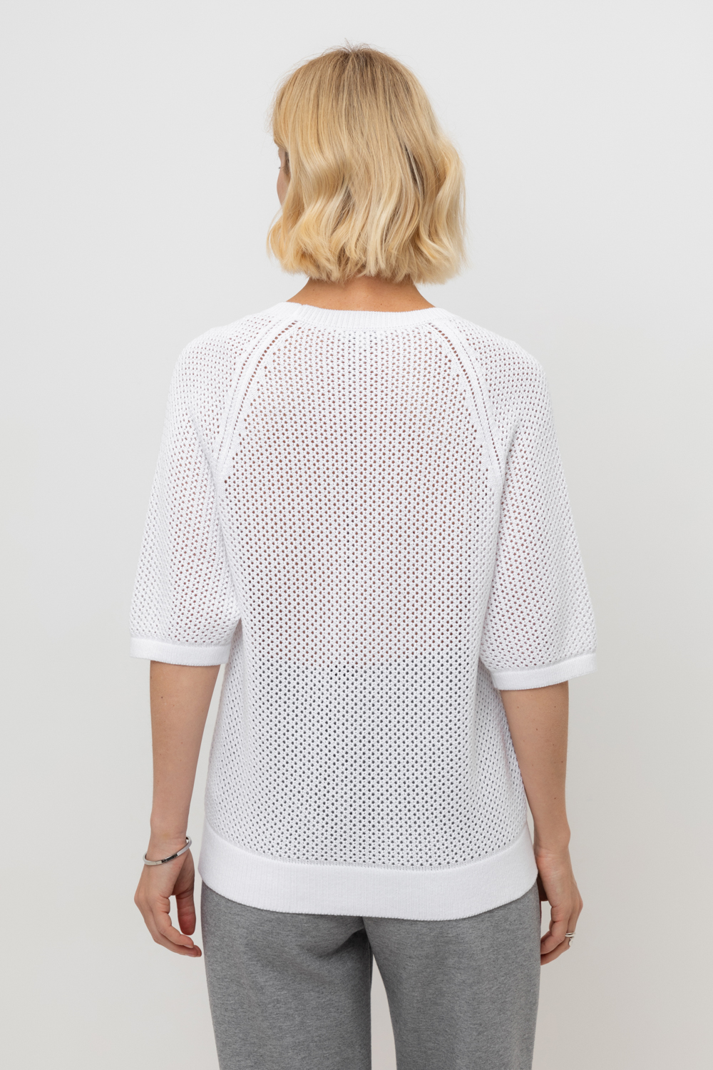 Джемпер свободного кроя ажурной вязки из итальянского хлопка. Умеренное переплетение, хлопок в составе, придают изделию форму и ощущение комфорта во время носки. Незаменим в повседневном летнем гардеробе.