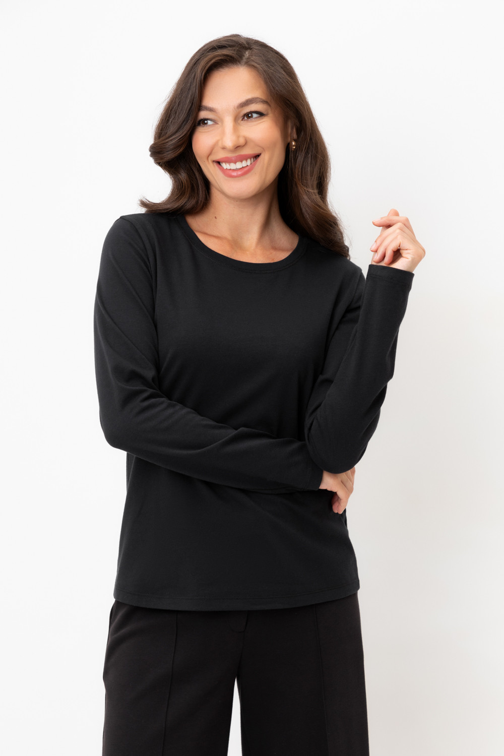 Базовый лонгслив из плотного однотонного трикотажа супрем с добавлением спандекса.
