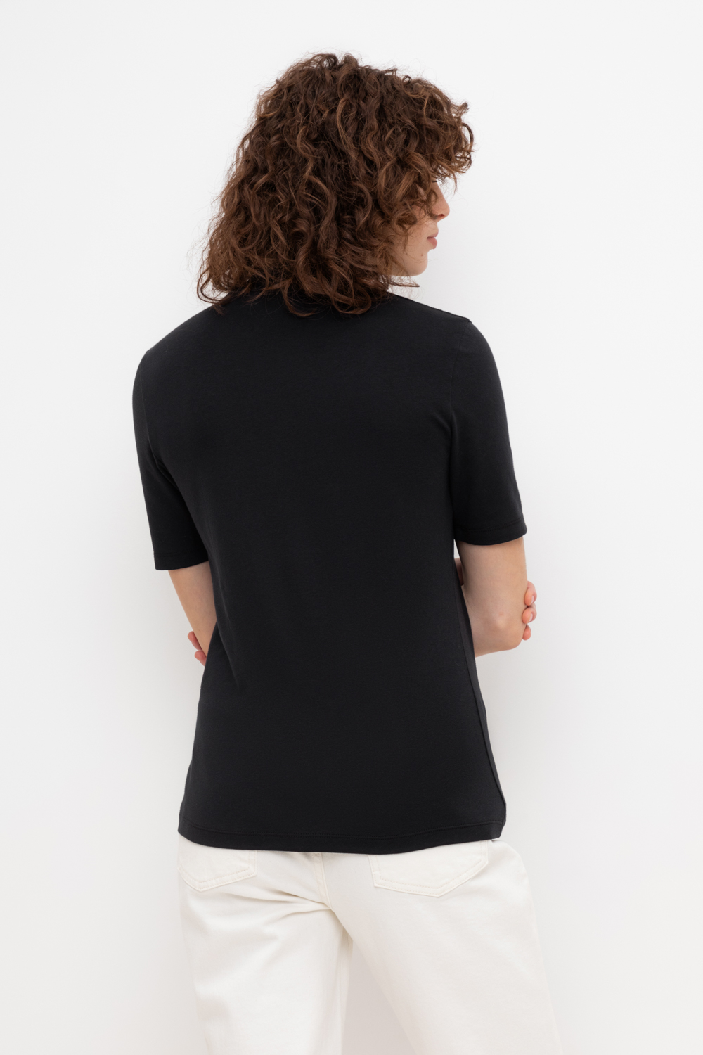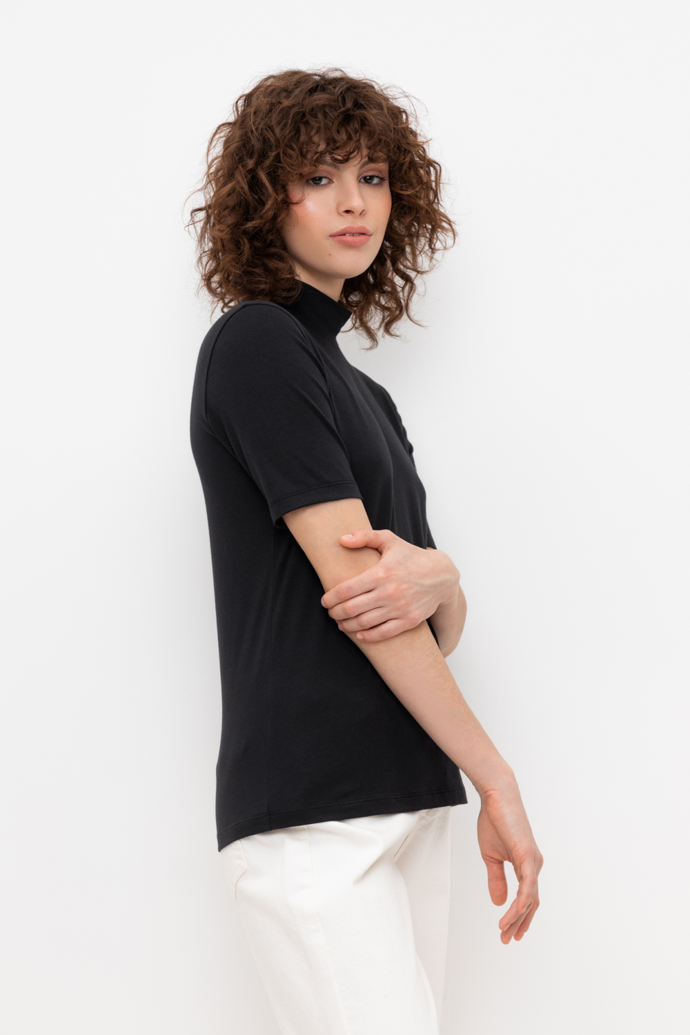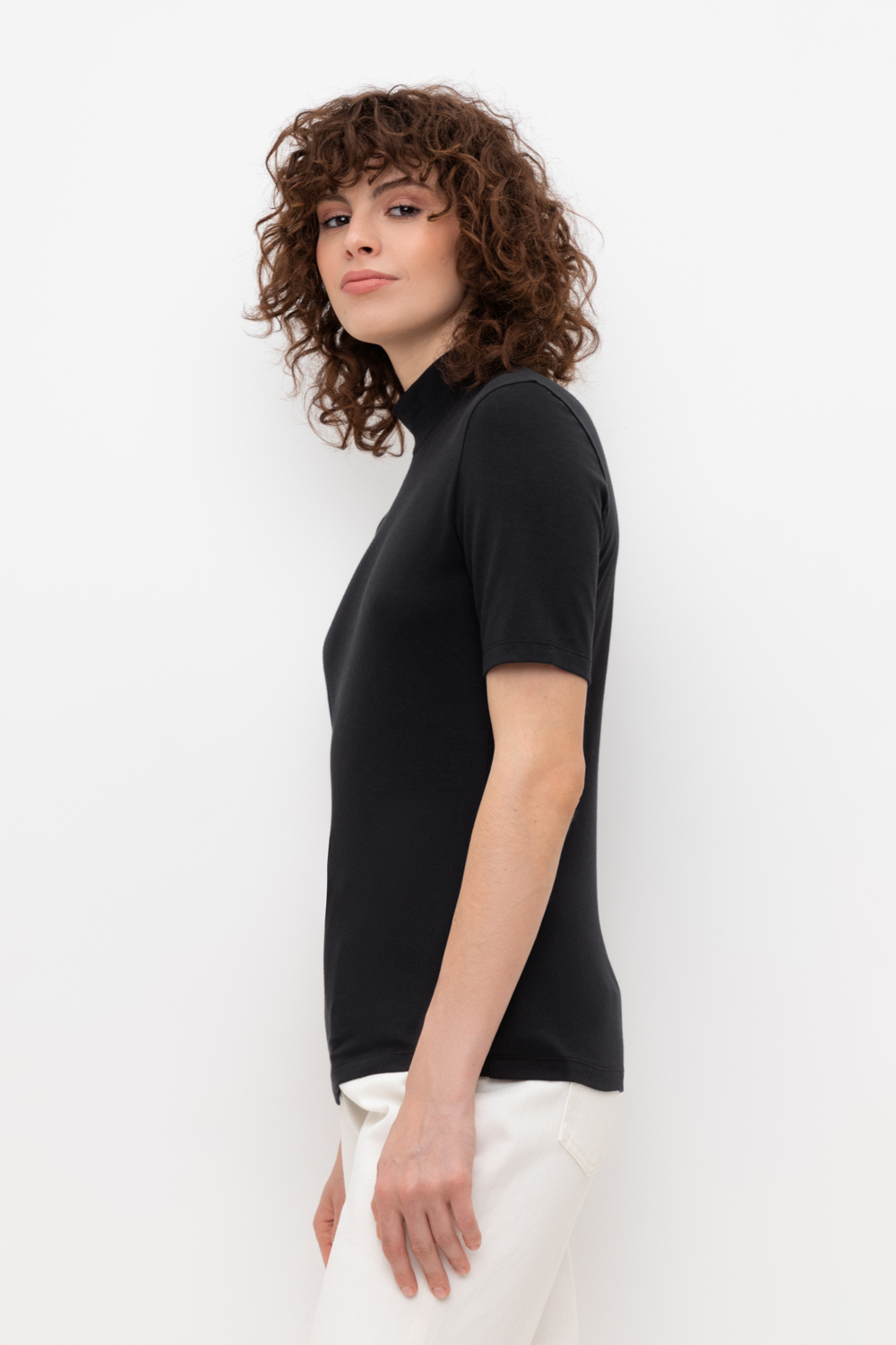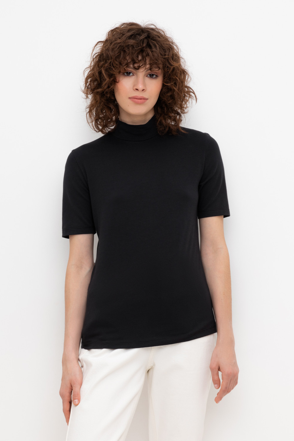 Базовый джемпер с короткими рукавами и воротником-стойкой из плотного однотонного трикотажа супрем с добавлением спандекса.