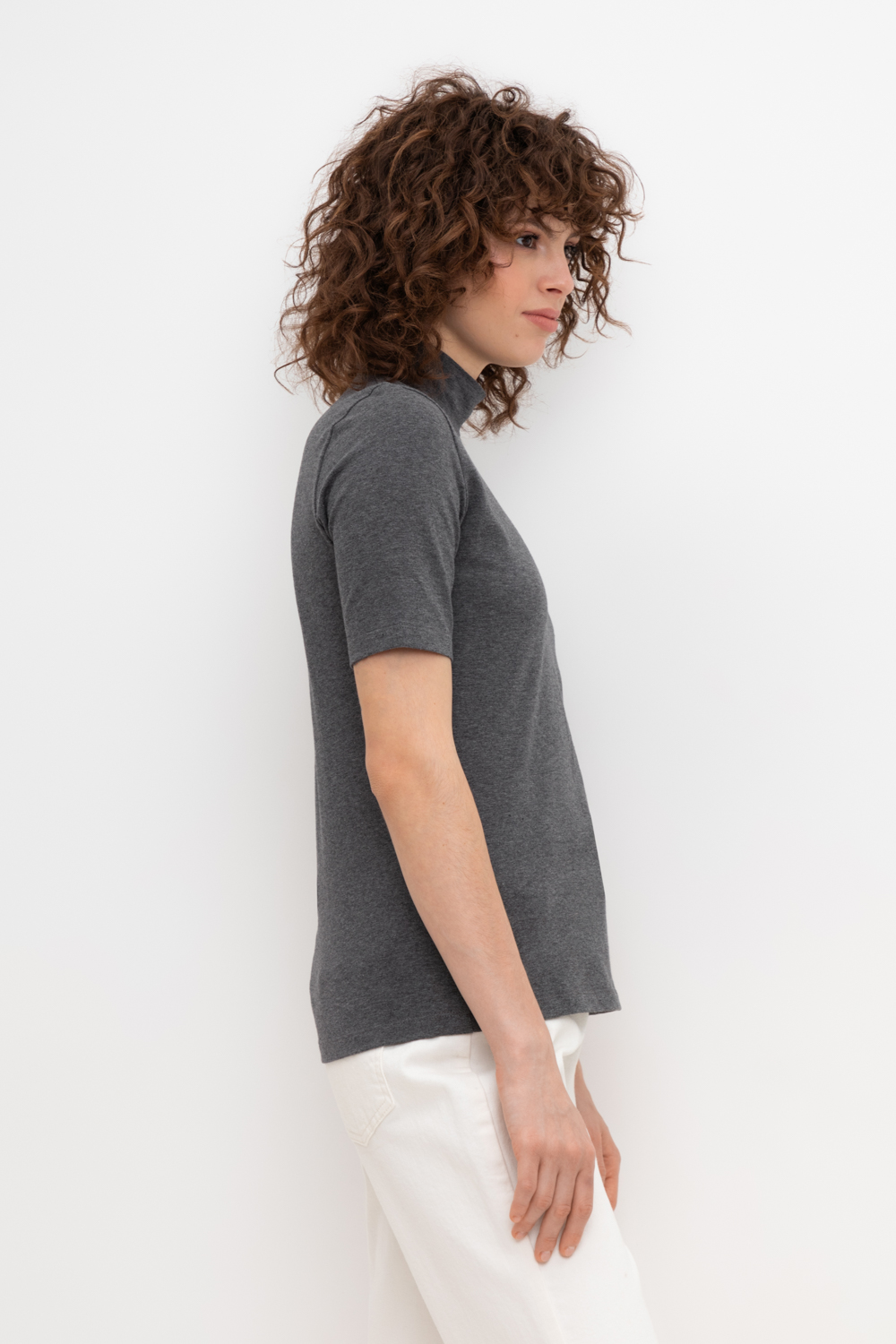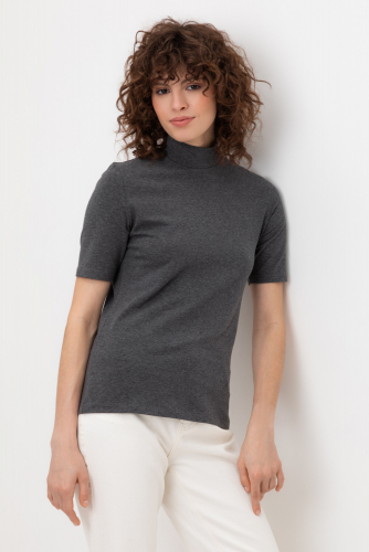 Базовый джемпер с короткими рукавами и воротником-стойкой из плотного однотонного трикотажа супрем с добавлением спандекса.