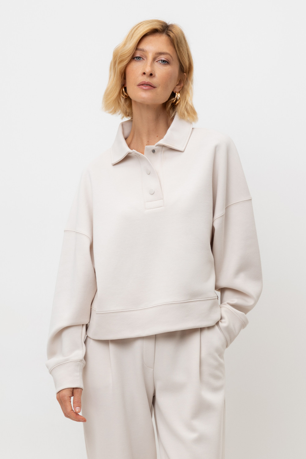 Джемпер-поло из высококачественного трикотажного полотна. За счет фактуры переплетения и специальных обработок сохраняют силуэт и форму. Хлопок в составе добавляет комфорт при носке. Выделяется благодаря спущенной линии плеча, что отличает его от традиционных моделей. Широкие манжеты и пояс формируют расслабленный стиль.