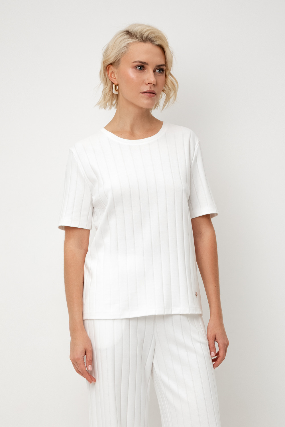 Базовая футболка из 100% гребенного хлопка. Необычное переплетение в виде широких полос придает изделию оригинальность, добавляя фактуры и динамики в образ. В сочетании с брюками из этой коллекции, вы создадите стильный образ для летних дней.