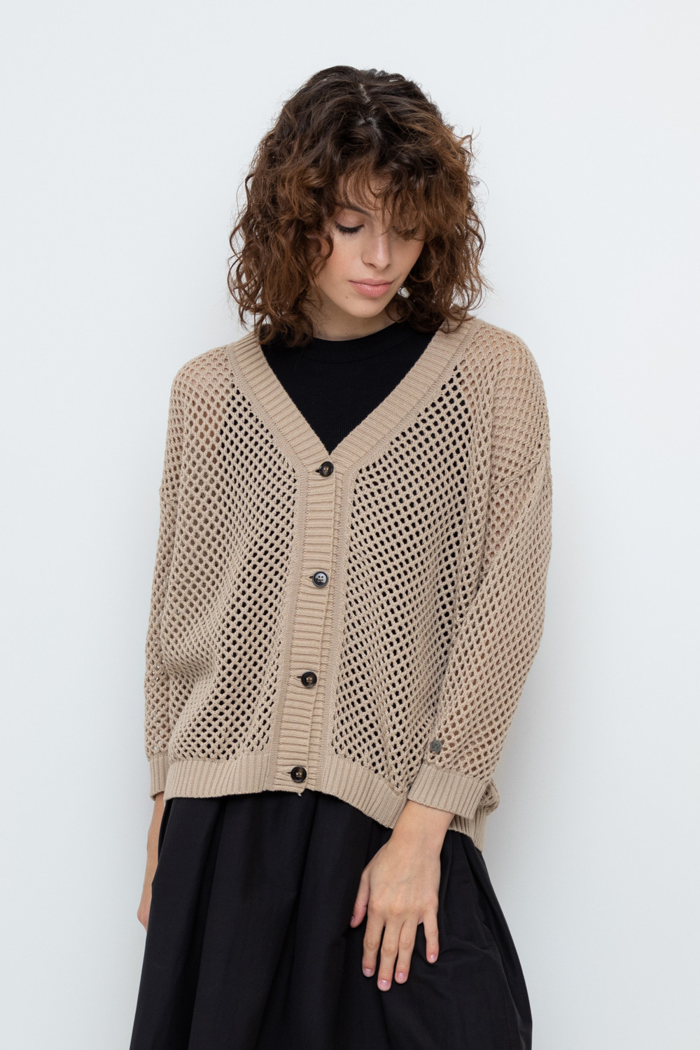 Укороченный вязаный ажурный кардиган на пуговицах. Состав 50% хлопок, 50% акрил. Благодаря акрилу в составе изделие не пилингуется.