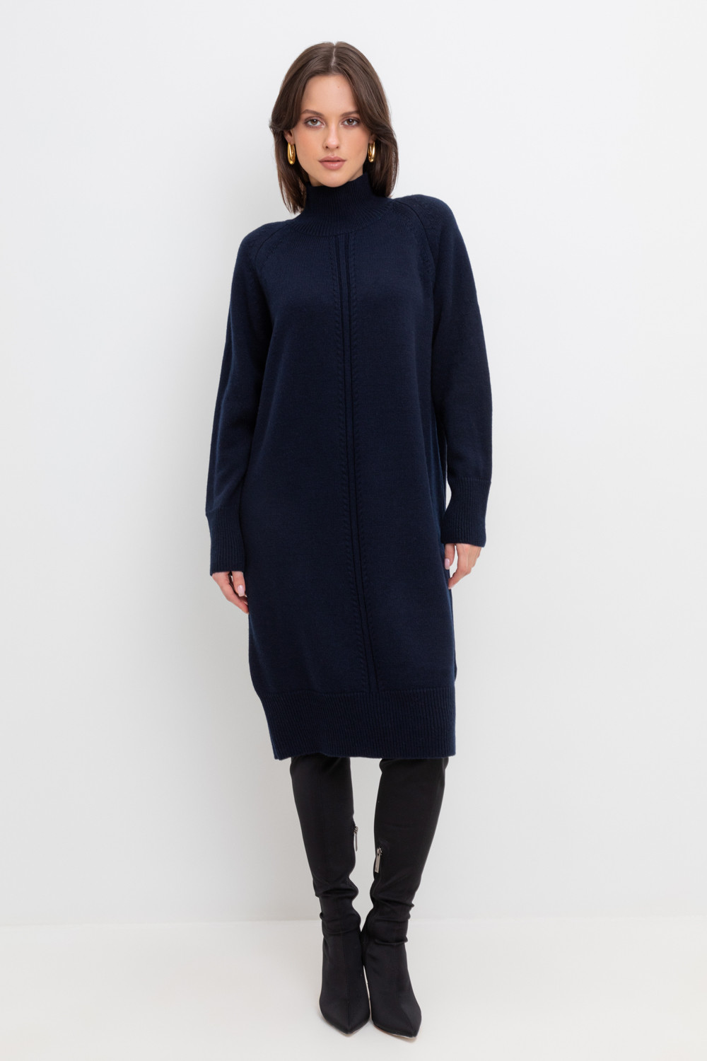 Вязаное платье длины миди с длинными рукавами реглан из полушерсти. Выполнено гладью. Прямой силуэт хорошо садится по фигуре. Манжеты и низ изделия вывязаны широкой резинкой, благодаря которой края не растягиваются.