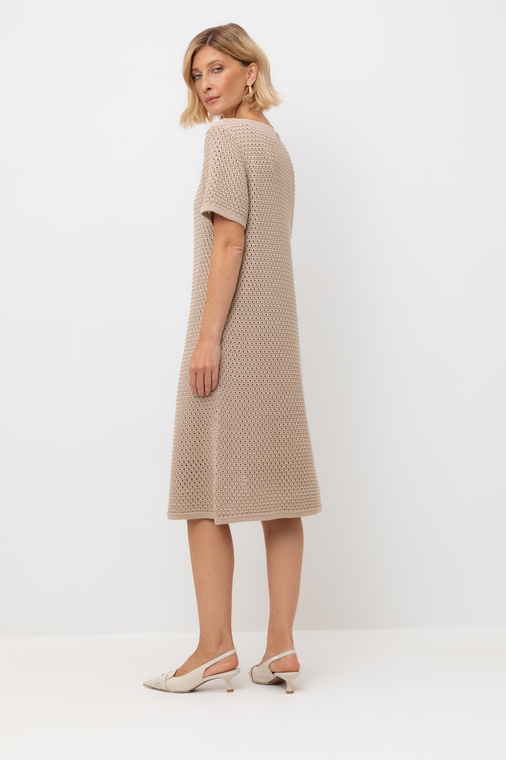Платье ажурной вязки в универсальном бежевом цвете из итальянского хлопка. Дополняет изделие внутренний невесомый подклад из премиального бифлекса телесного цвета. Хлопок в составе сохраняет форму и дарит ощущение комфорта во время носки.