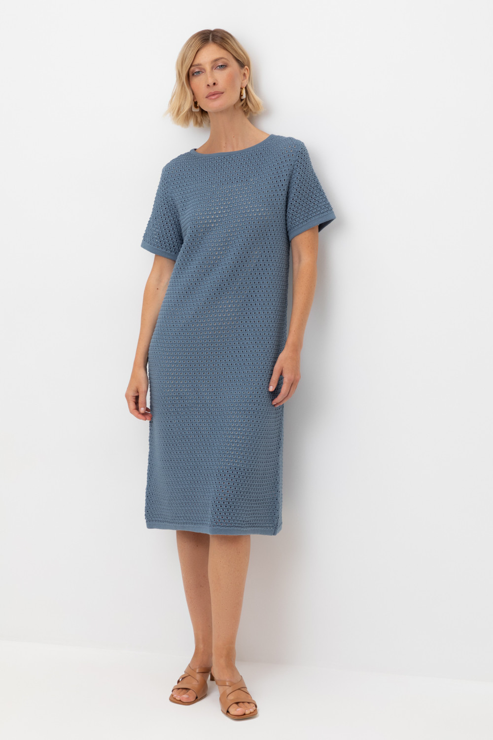 Платье ажурной вязки в нежно-голубом оттенке из итальянского хлопка. Дополняет изделие внутренний невесомый подклад из премиального бифлекса телесного цвета. Хлопок в составе сохраняет форму и дарит ощущение комфорта во время носки.