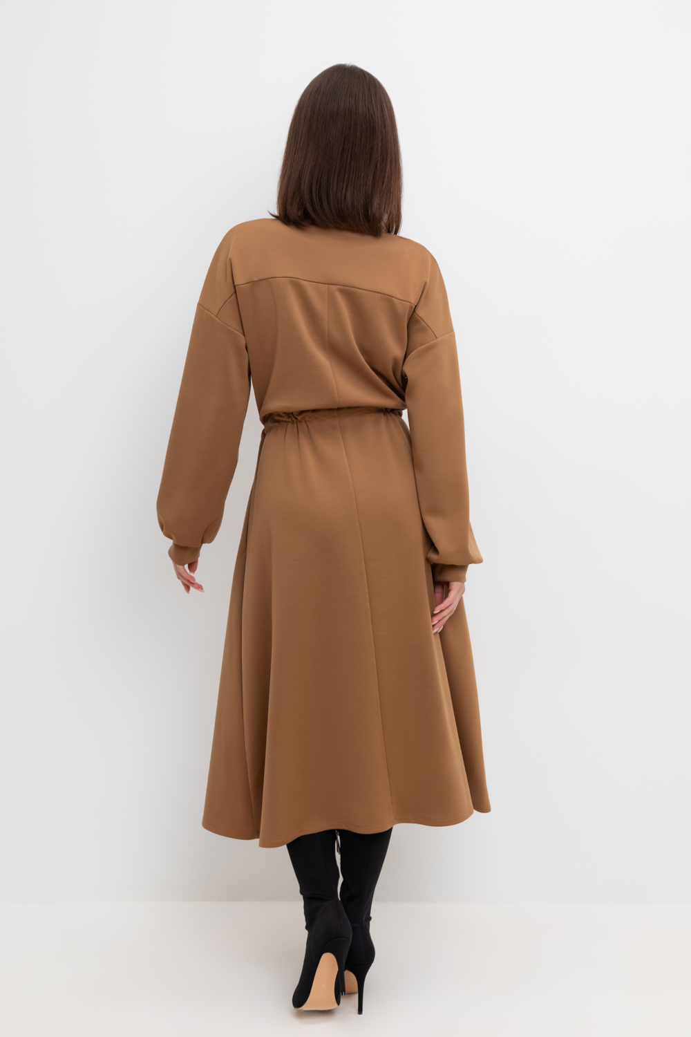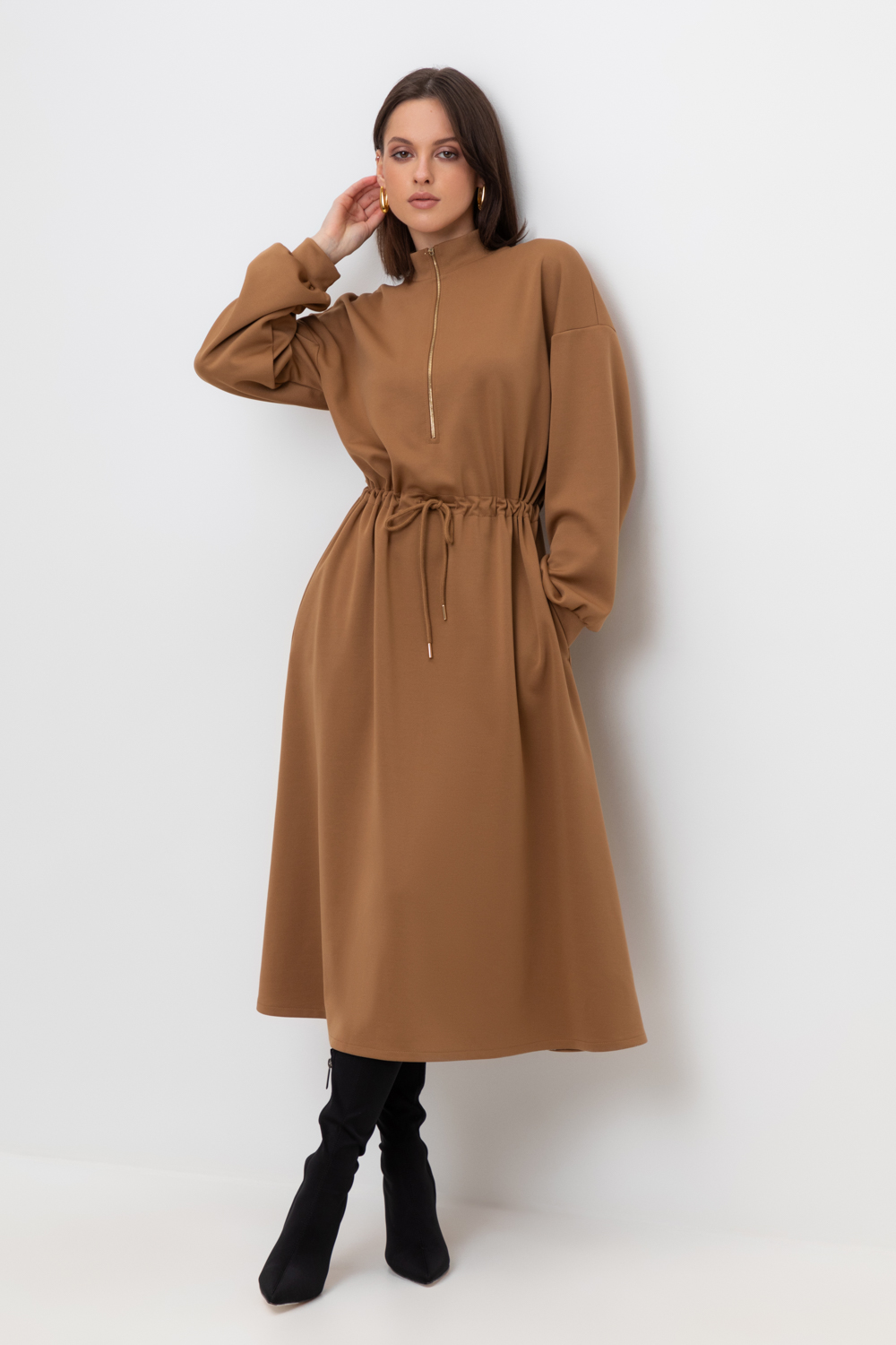 Платье с кулиской из плотного гладкого трикотажа интерлок с застежкой на молнию. Кулиска по линии талии подчеркивает женственность пропорций. Шнурок с наконечниками для утяжки служит украшением. Спущенное плечо придает изделию свободный силуэт.