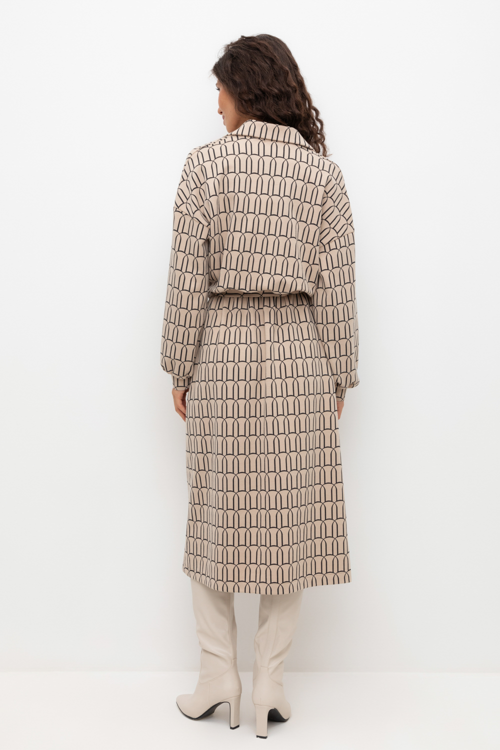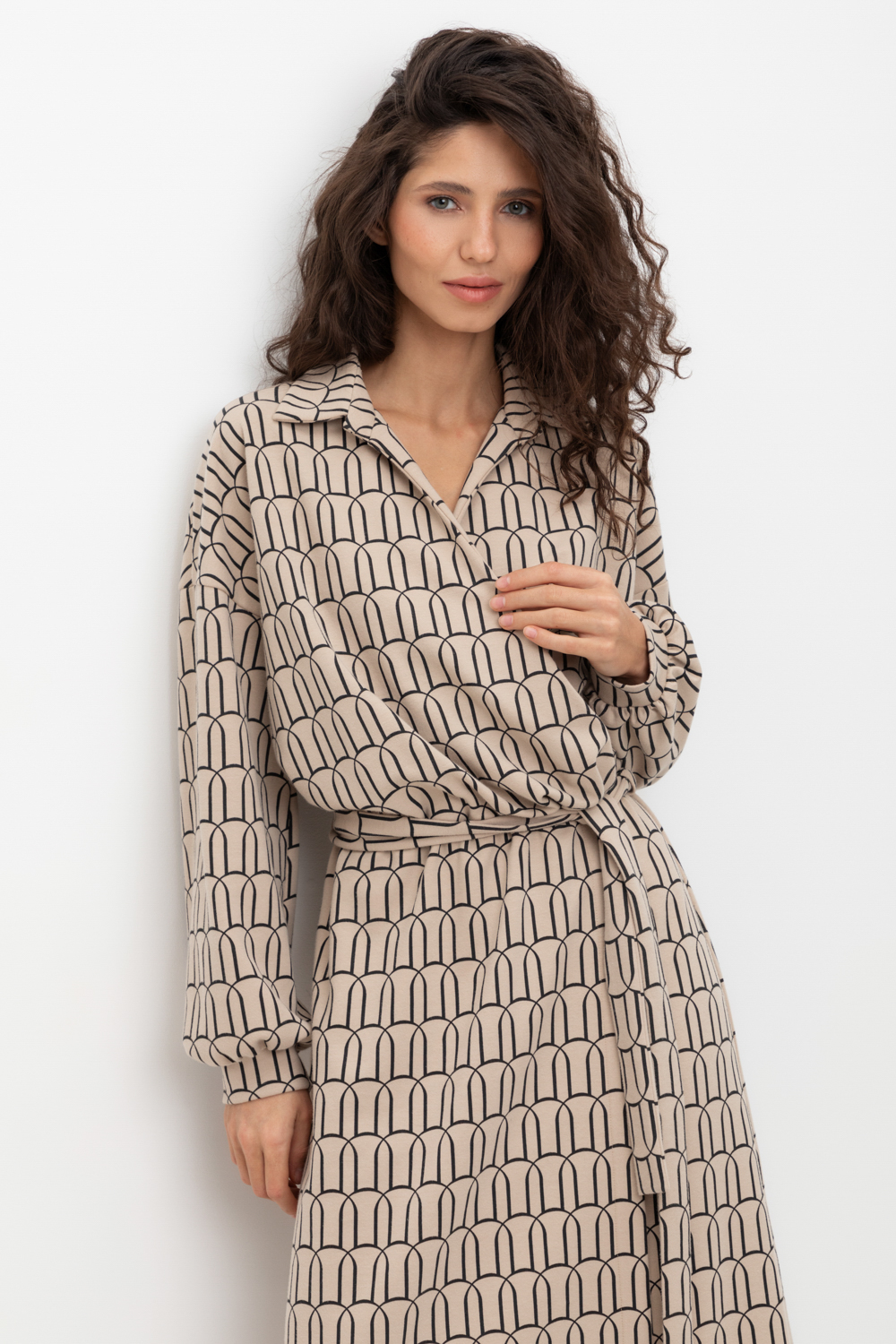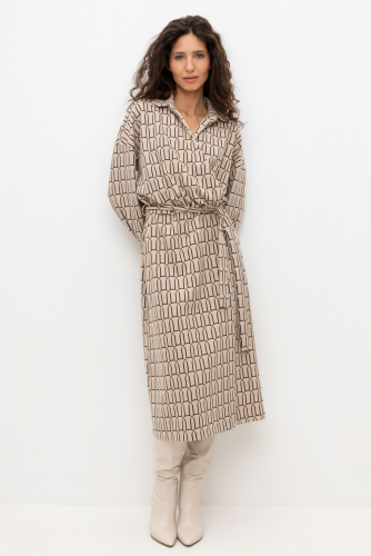 Платье на запах с воротником из плотного набивного трикотажа интерлок. Модель с длинными объемными рукавами. С помощью пояса можно регулировать посадку и силуэт.