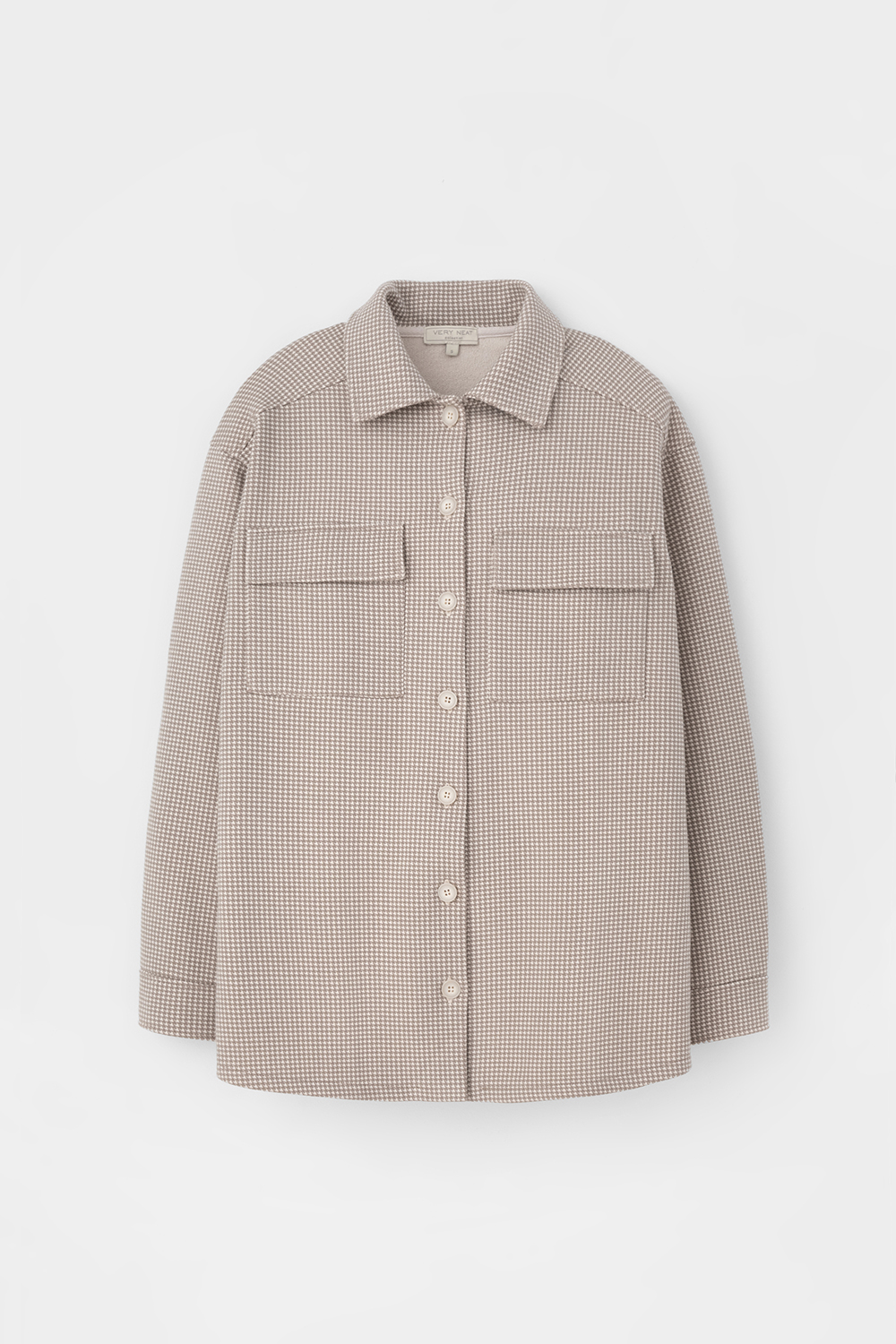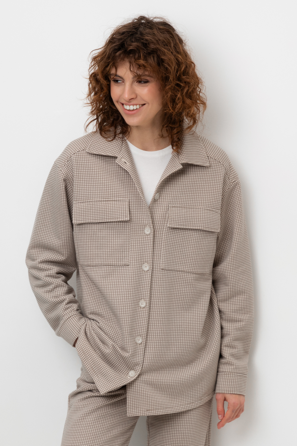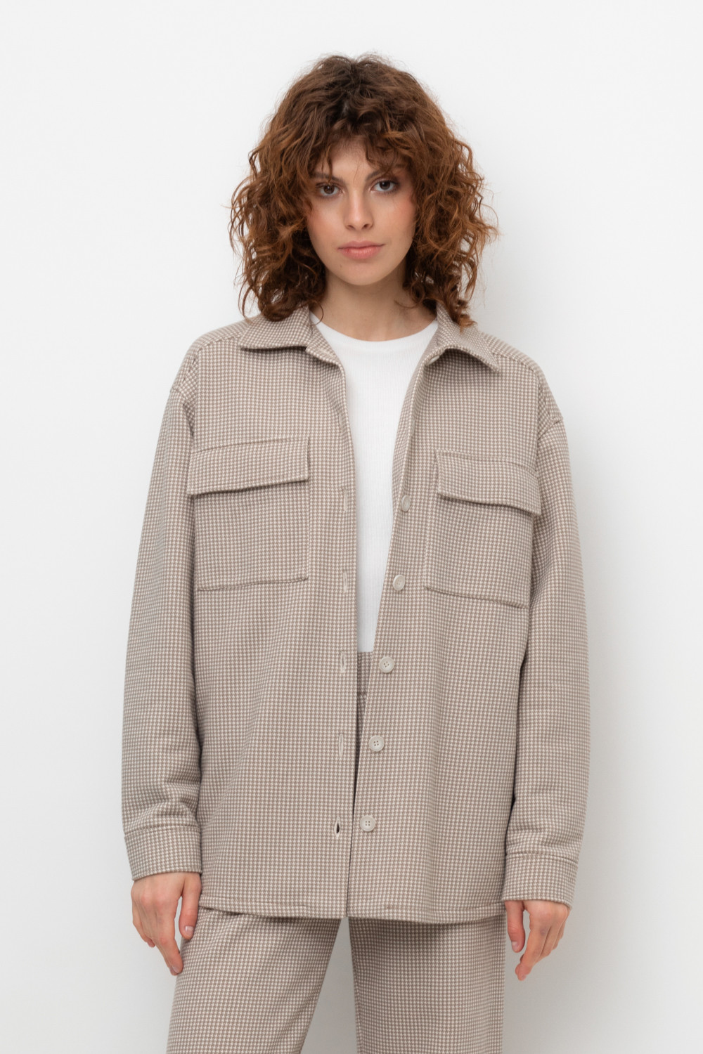 Уютная трикотажная рубашка с отложным воротником и накладными карманами с клапанами из петельчатого футера трёхнитки. В составе 80% натурального хлопка и 20% полиэстера, при этом полиэстер ввязан внутрь по особой технологии и не соприкасается с кожей. Свободная посадка и спущенные плечи придают рубашке модный объём. Застёгивается спереди на пуговицы.