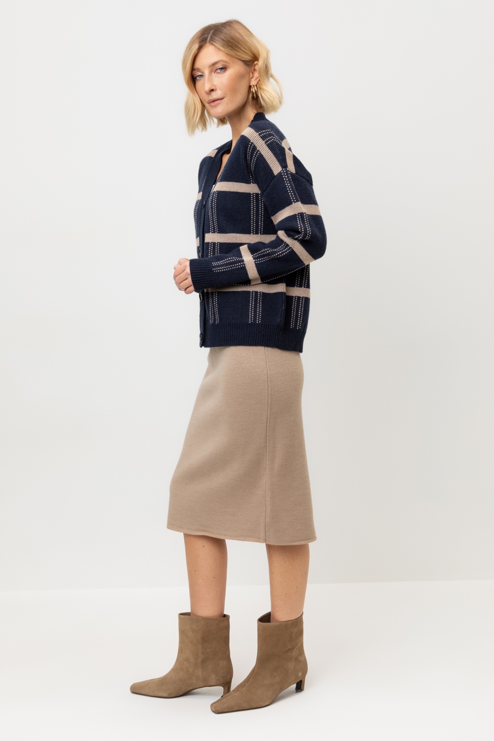 Юбка вязаная длины миди из полушерстяной пряжи. Состав 50% шерсть и 50% акрил. Шерсть в составе сохраняет тепло, а акрил делает изделие мягким и обьемным.