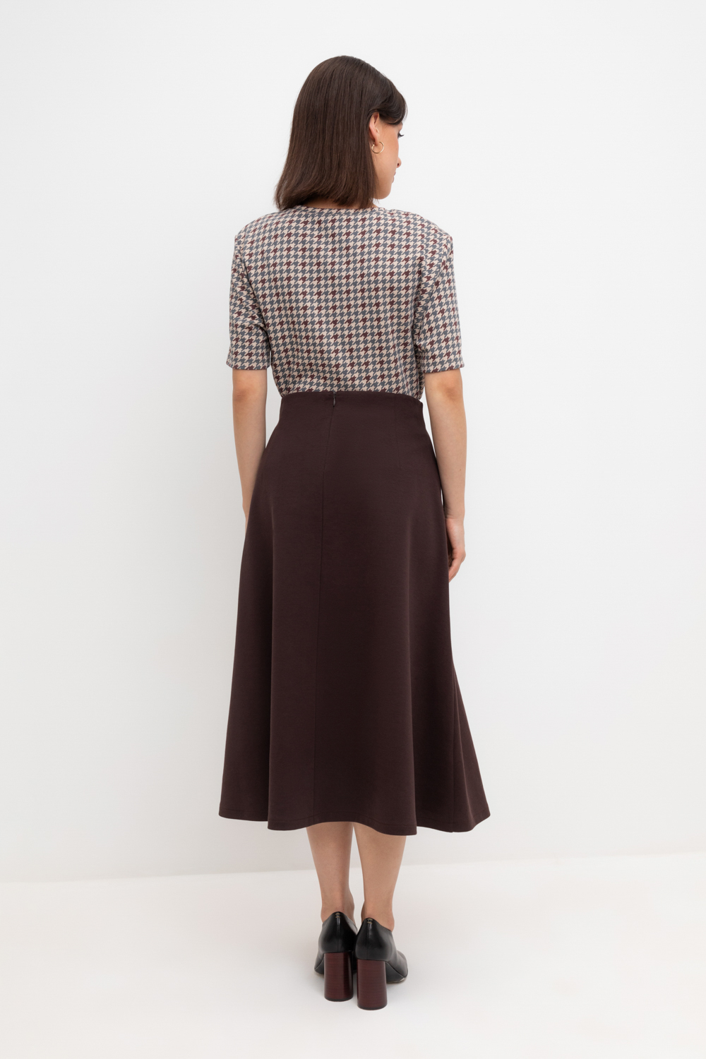 Трикотажная юбка длины миди из плотного гладкого трикотажа интерлок, произведенного из высококачественного гребенного хлопка. В составе 85% натурального хлопка и 15% полиэстера, при этом полиэстер ввязан внутрь по особой технологии и не соприкасается с кожей. Застегивается на потайную молнию. Изделие сохраняет цвет и форму после многократных стирок.