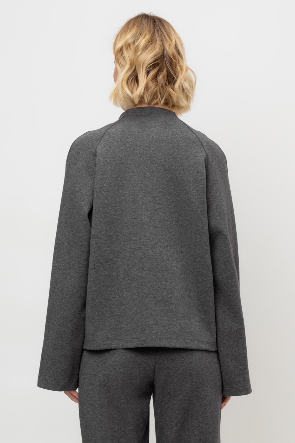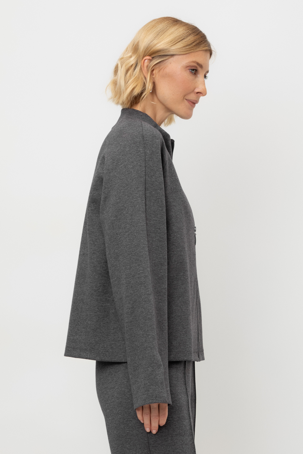 Жакет на молнии с воротником-стойкой, выполненный из плотного гладкого трикотажа интерлок. В составе 80% натурального хлопка и 20% полиэстера, при этом полиэстер ввязан внутрь по особой технологии и не соприкасается с кожей. Рукава с разрезами.