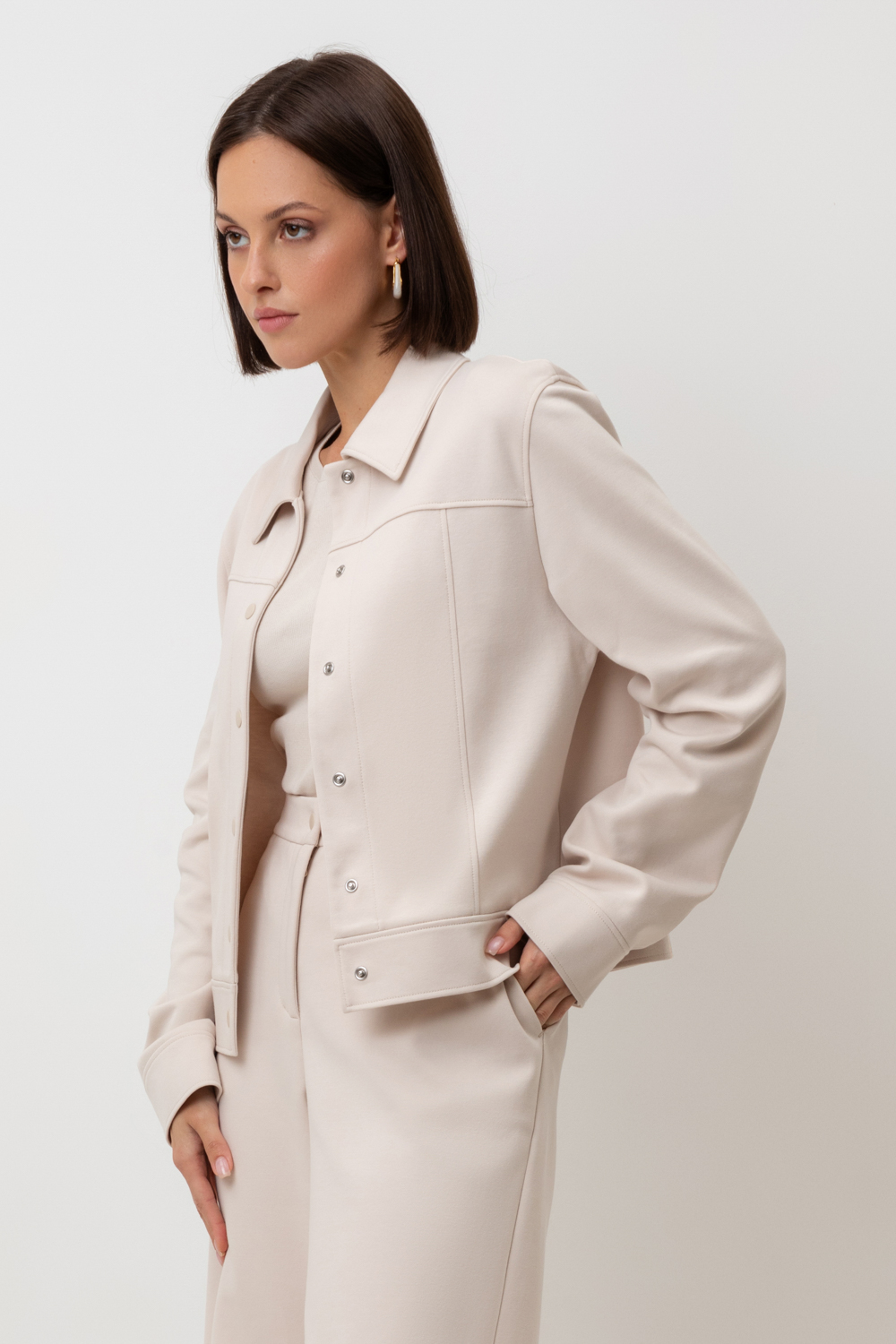 Укорочённый жакет, изготовленный из премиального трикотажного полотна DOUBLE FACE . За счет фактуры переплетения и специальных обработок сохраняет силуэт и форму, что позволяет сочетать его как с юбкой, так и с брюками. Хлопок в составе добавит комфорта при носке.