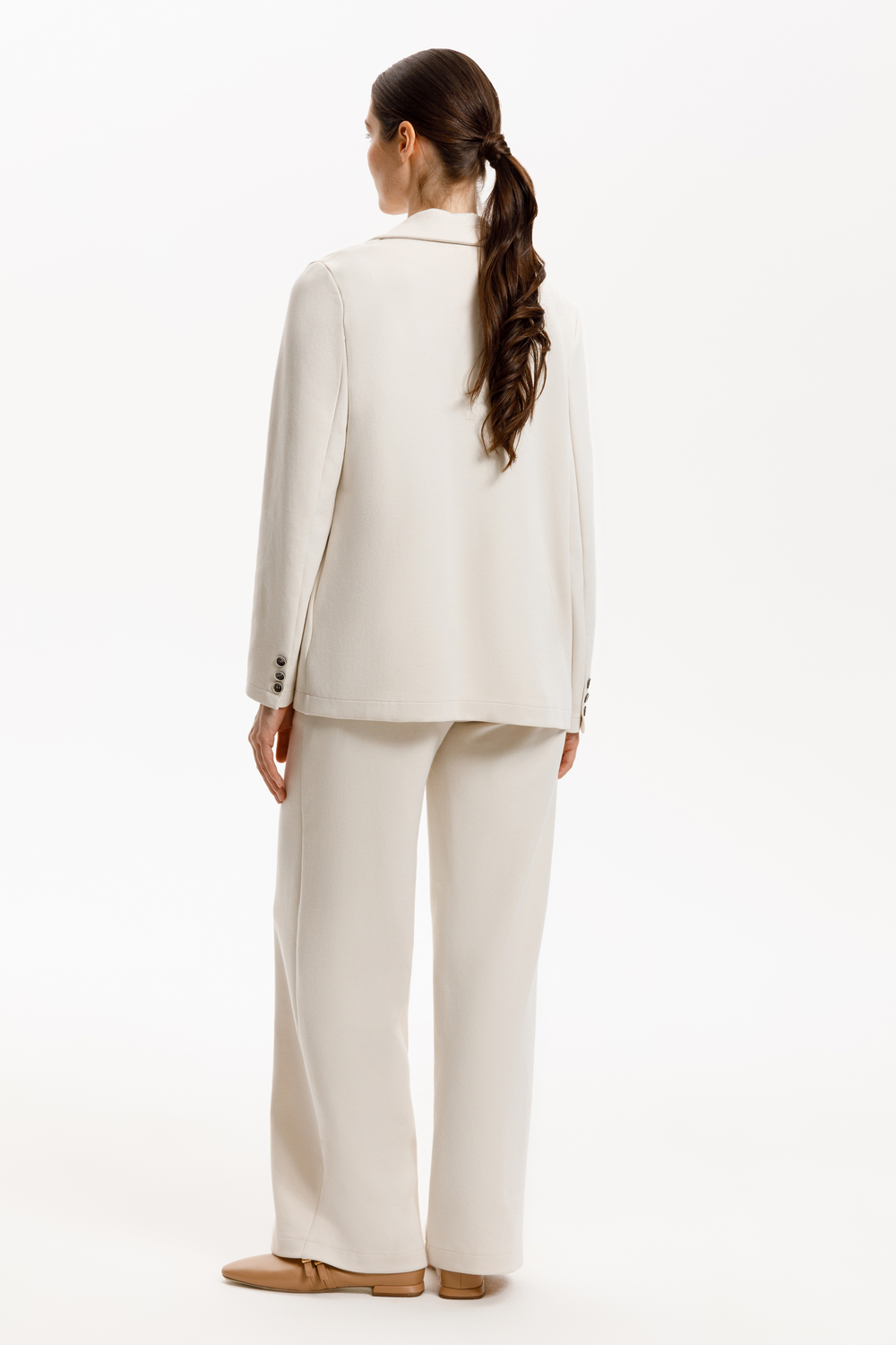 Однобортный жакет приталенного силуэта из премиального трикотажа DOUBLE FACE. За счет фактуры переплетения, добавления спандекса и специальных обработок сохраняет силуэт и форму. Хлопок в составе добавляет комфорта при носке.