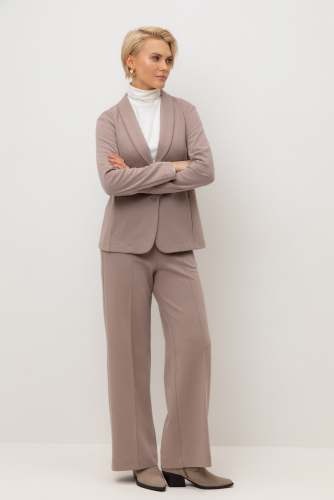 Приталенный пиджак изготовлен из высококачественного трикотажного полотна DOUBLE FACE. Трикотаж прошел специальную каучуковую обработку, что придает пиджаку легкость и шелковистую текстуру. Благодаря уникальному переплетению и специальным методам обработки, он сохраняет свой силуэт и форму, что позволяет легко комбинировать его как с юбками, так и с брюками.