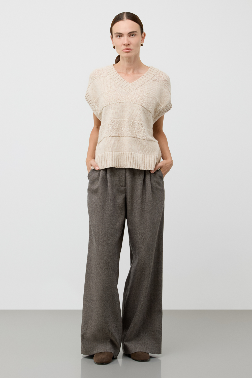 Жилет из изысканной пряжи с пайетками. Уникальное сочетание натуральных волокон обеспечивает непревзойденную мягкость. Меринос отлично удерживает тепло, альпака дарит легкость и воздушность, кашемир придает шелковистость, а вискоза приятный блеск. Нежные пайетки ненавязчиво мерцают при каждом движении, добавляя Вашему образу утонченную элегантность.