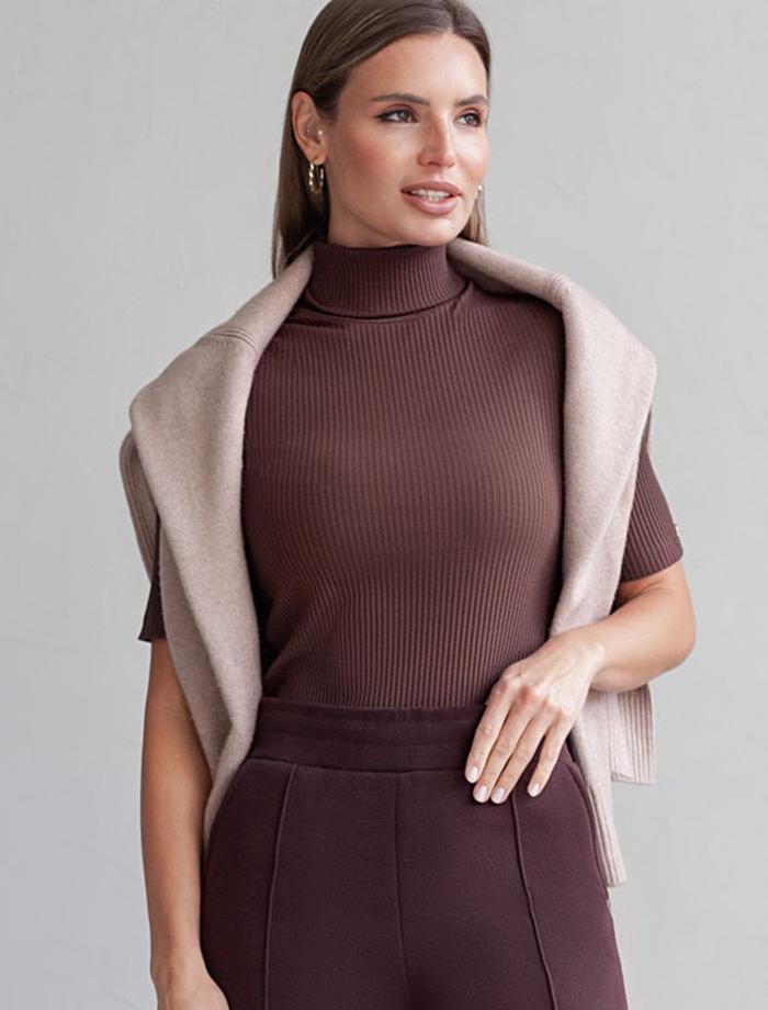 Водолазка с коротким рукавом выполнена из фактурного трикотажа в рубчик. Модель идеально сидит по фигуре не сковывая движения. Хлопковый трикотаж поддерживает оптимальную температуру тела, поэтому в изделии будет комфортно в течении всего дня. Наличие эластана в составе гарантирует формоустойчивости. Водолазка отлично впишется в деловой дресс-код и подойдет для повседневного аутфита.