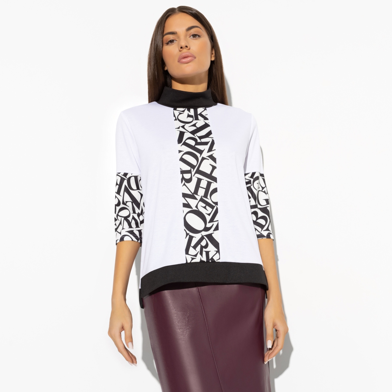 Интеллектуальный фешн – как много в этой фразе. Быть осознанным в каждом своем выборе, значит, свести к минимуму риск ошибки. Водолазка с алфавитным принтом – еще одно доказательство того, что вы на правильном модном пути. Водолазка прямого силуэта. Комбинация трех видов ткани. Акцентные вставки прошиты. Есть деликатные разрезы по бокам изделия.