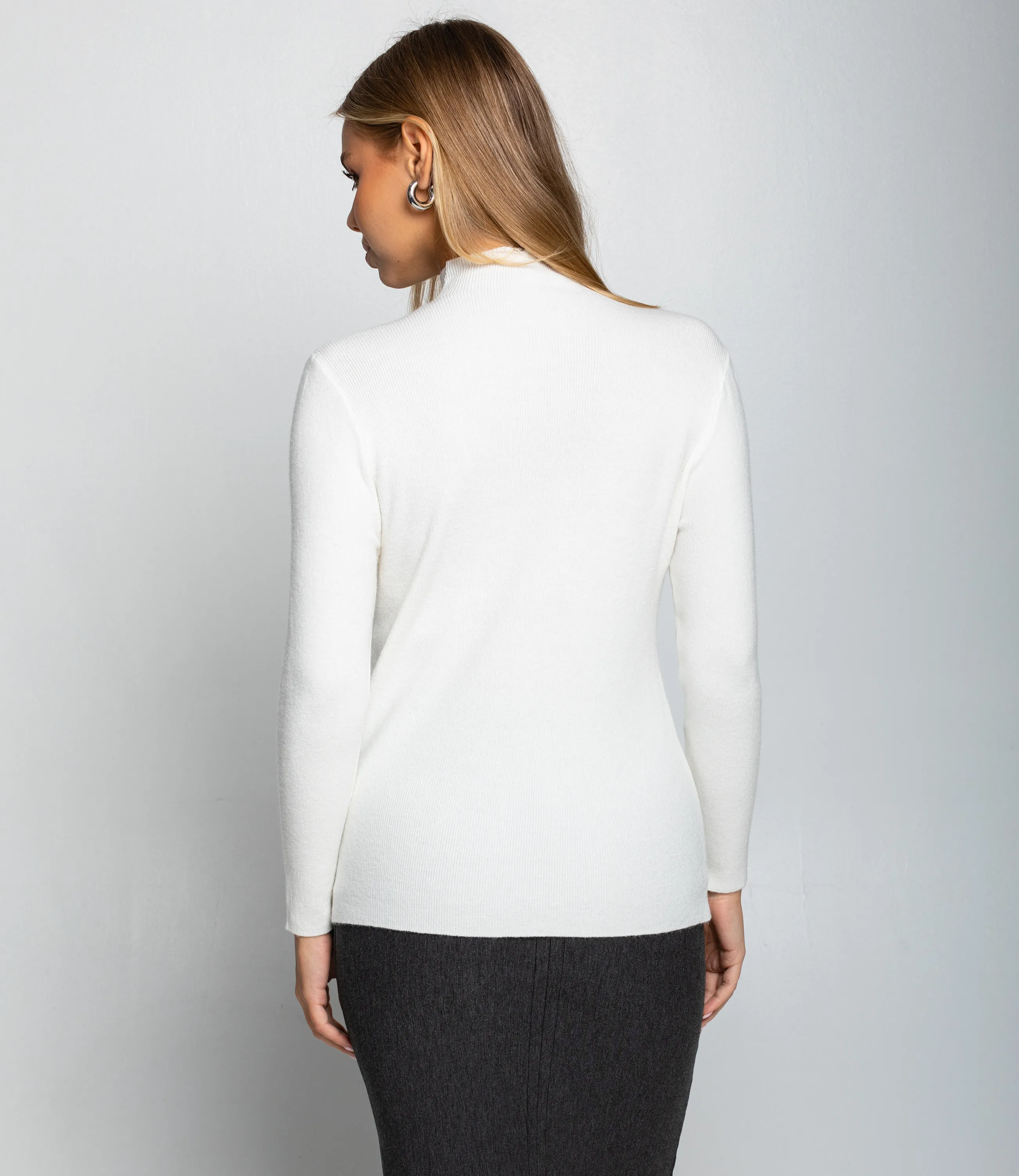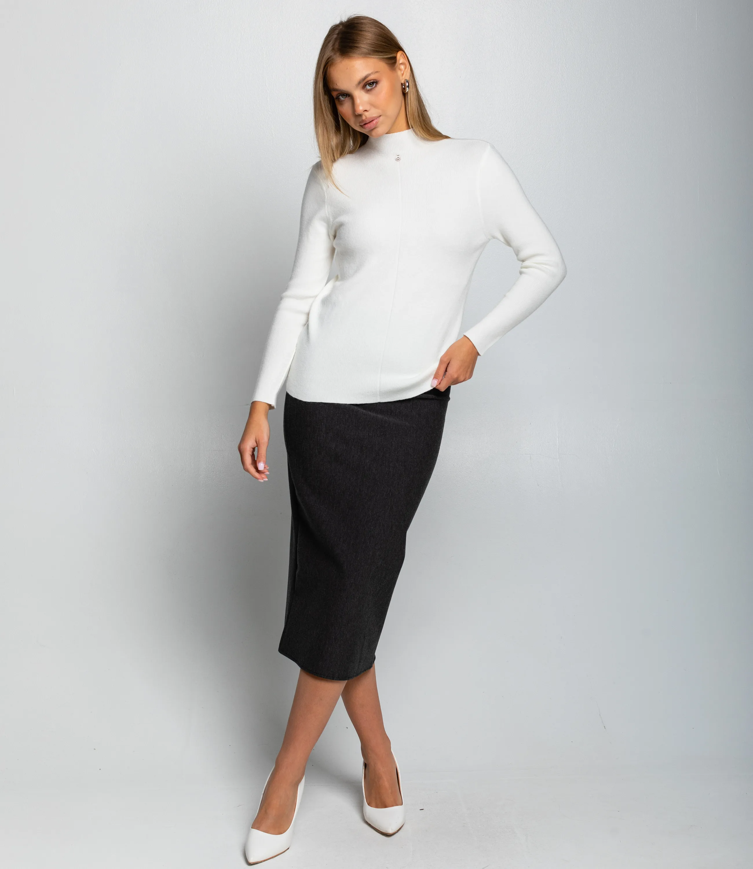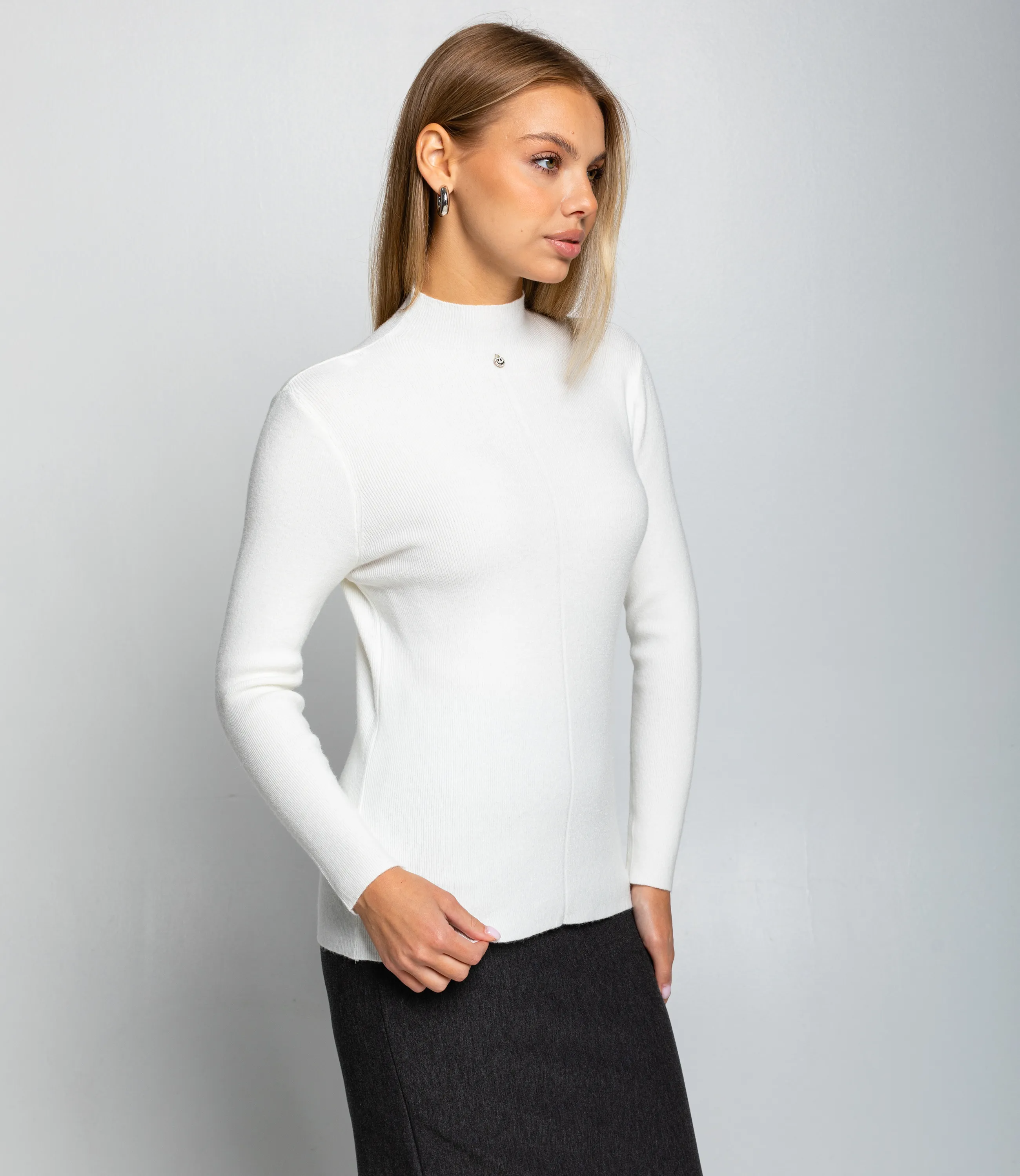 Водолазка — это часть гардероба, которая подчёркивает женственность и утончённость каждой покупательницы. Модель выполнена из гладкого трикотажного материала с тонкой и плотной фактурой; облегающий силуэт, классический высокий воротник и длинные приталенные рукава создают лаконичный и универсальный образ. По центру передней части проходит едва заметный вертикальный шов, добавляющий композиционной строгости и изящества, а небольшая металлическая подвеска‑улыбка со стразами придаёт изделию аккуратную стильную деталь. Водолазка отлично вписывается в базовый гардероб и легко комбинируется с брюками и юбками, а также служит идеальным слоем в многослойных образах. Для пошива использована ткань 65% хлопок, 30% полиэстер, 5% эластан: хлопок обеспечивает комфорт и хорошую воздухопроницаемость, полиэстер повышает прочность и стойкость цвета, эластан гарантирует посадку и сохранение формы после носки и стирок. Материал устойчив к частым стиркам, не деформируется и долго сохраняет презентабельный вид, что снижает количество возвратов и рекламаций. Для оптовых покупателей водолазка является выгодной и оборотистой позицией: базовый дизайн упрощает формирование размерного ряда и уменьшает риск непроданных остатков, а универсальность модели повышает её привлекательность для широкой аудитории. Рост 168, 89-63-90.